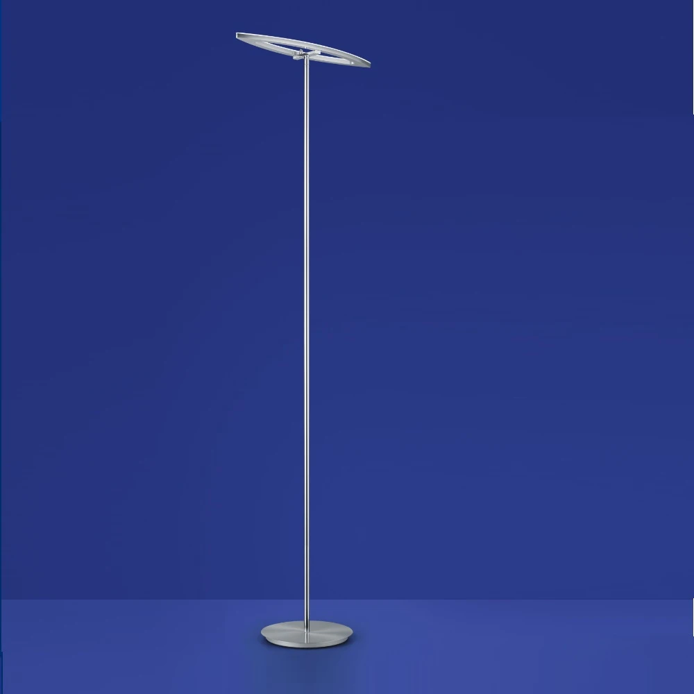 Durch das minimalistische Design und ihre Unauffälligkeit passt die Stehlampe in fast jedes Interieur, die Oberfläche ist Nickel-matt, einzelne Elemente sind in hochglänzend Chrom abgesetzt.