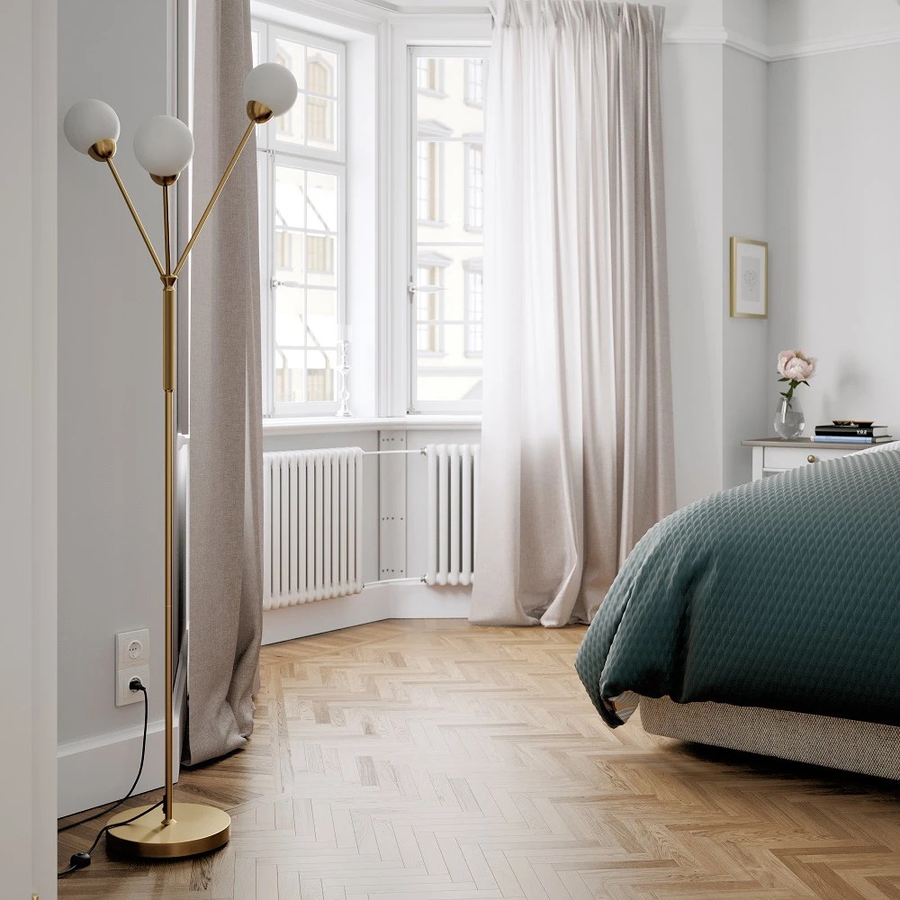 Die Standleuchte gabelt sich in der Höhe in drei Arme. Am Ende jedes Armes befindet sich ein rundes Opalglas. Diese verbergen die G9 Fassungen, welche für je ein G9 Leuchtmittel mit maximal 20 Watt geeignet sind. So geht blendfreies, harmonisches Licht von der Wohnraumleuchte im skandinavischen Stil aus.