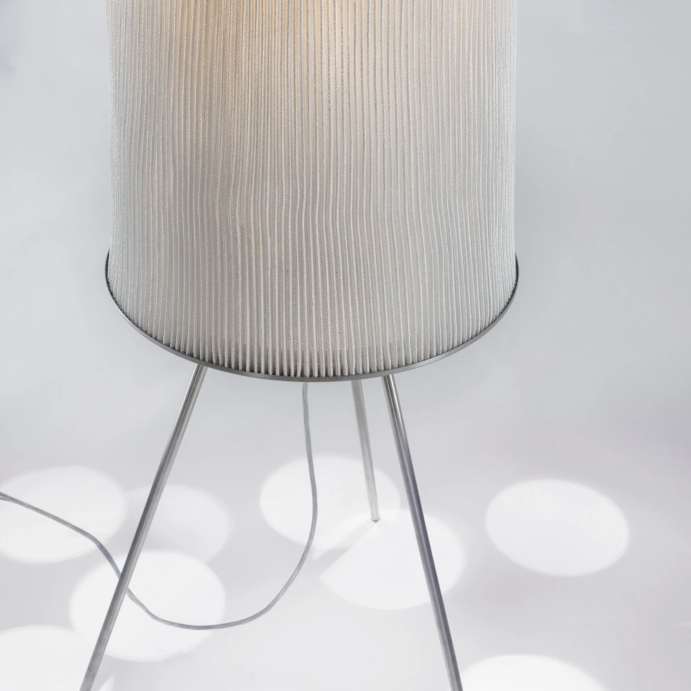 Der spanische Designer Arturo Alvarez hat die edle Stehleuchte Ura entworfen. Sie ist handgefertigt und besteht aus einem Schrim aus einem Edelstahl-Metallgeflecht und einer Halterung aus Edelstahl.