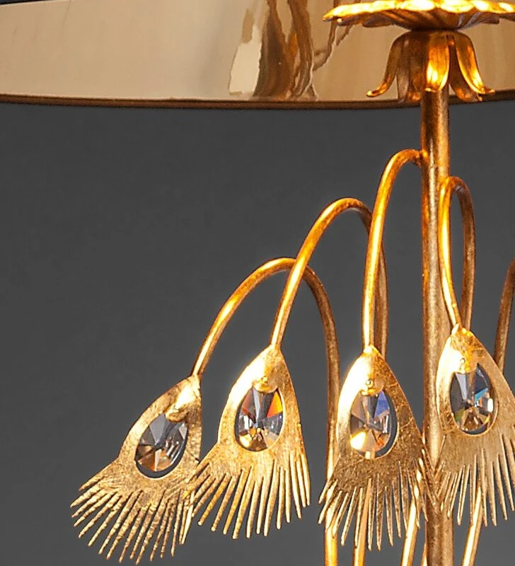 Sehr individuell ist das Design. Der Leuchtenständer besteht aus mehreren Gebilden, die dem Leuchtenfuß entspringen und wie die Schwanzfedern eines Pfaus gestaltet sind. Diese enden jeweils in einem transparenten Kristall. Ein brillantes Funkeln ist das Ergebnis. Die Oberfläche ist mit Blattgold beschichtet und anschließend mit weißer Patina versehen. Der asymmetrische Lampenschirm in Schwarz setzt dem Ganzen, nicht nur durch das goldglänzende Innenleben, die Krone auf.
