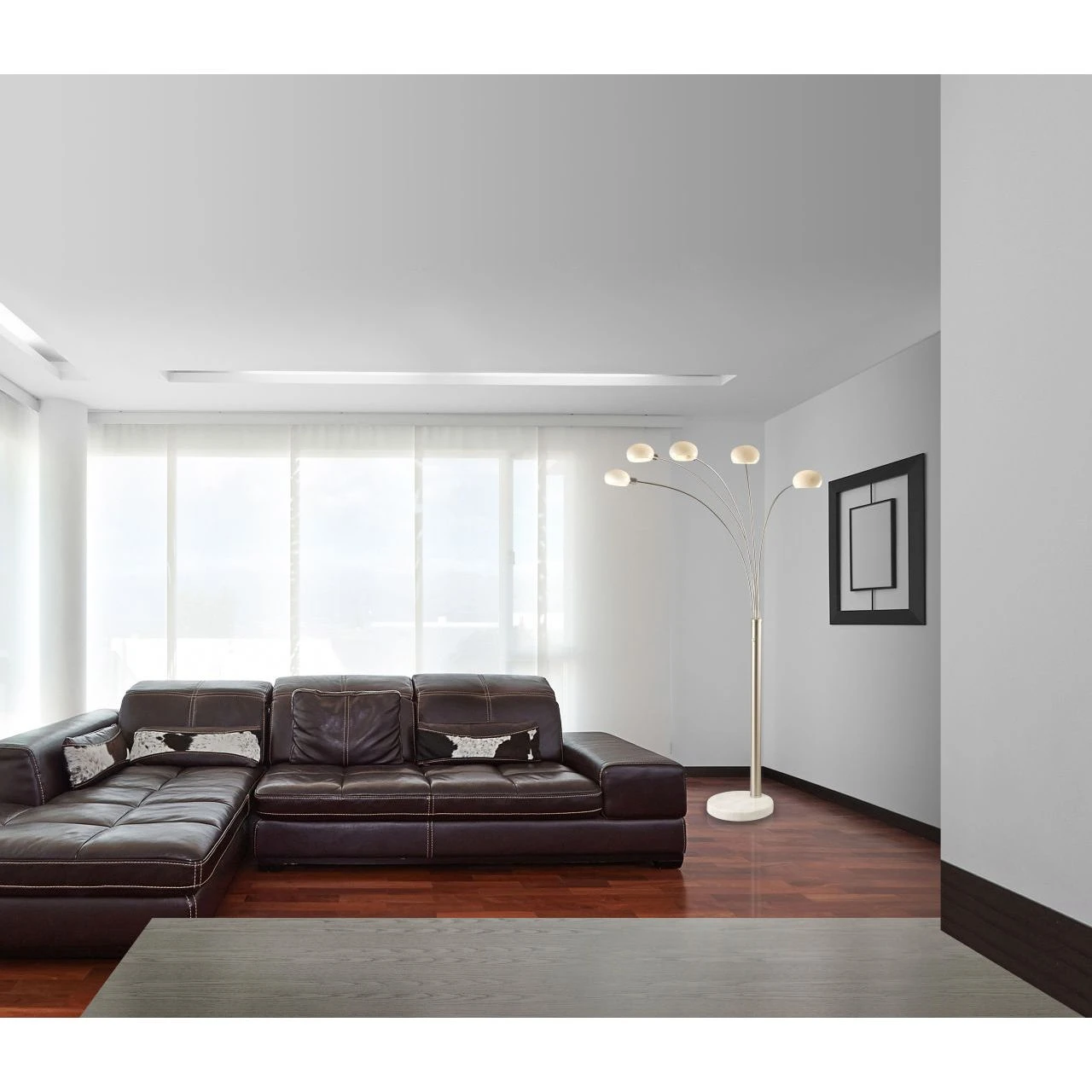 Elegant und modern, das verbindet diese wundervolle nickel matte Stehlampe mit einem Marmorsockel. Die fünf angebrachten Strahler werden von Glasschirmen umhüllt und durch die E14 Fassungen steht es Ihnen frei, selbst zu entscheiden welches Leuchtmittel (max. 40W) Sie verwenden wollen und somit auch die Lichtstärke und Lichtfarbe. Ein angebrachter Dimmer und eine Größe von 210 cm vervollständigen das Ganze.