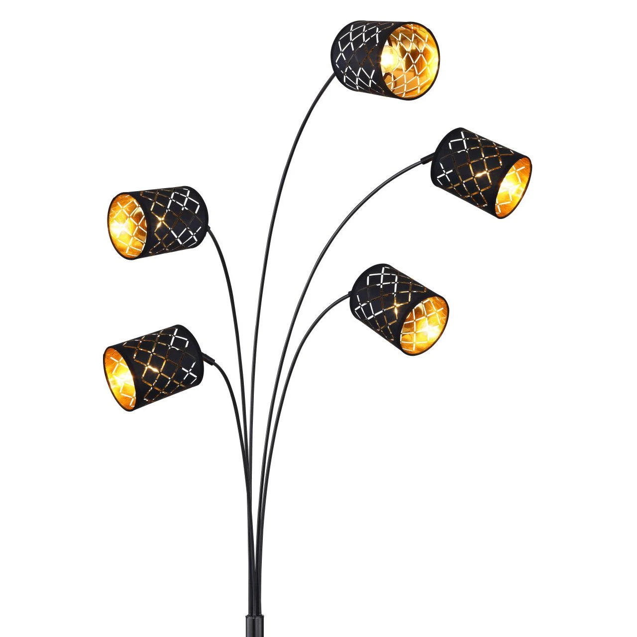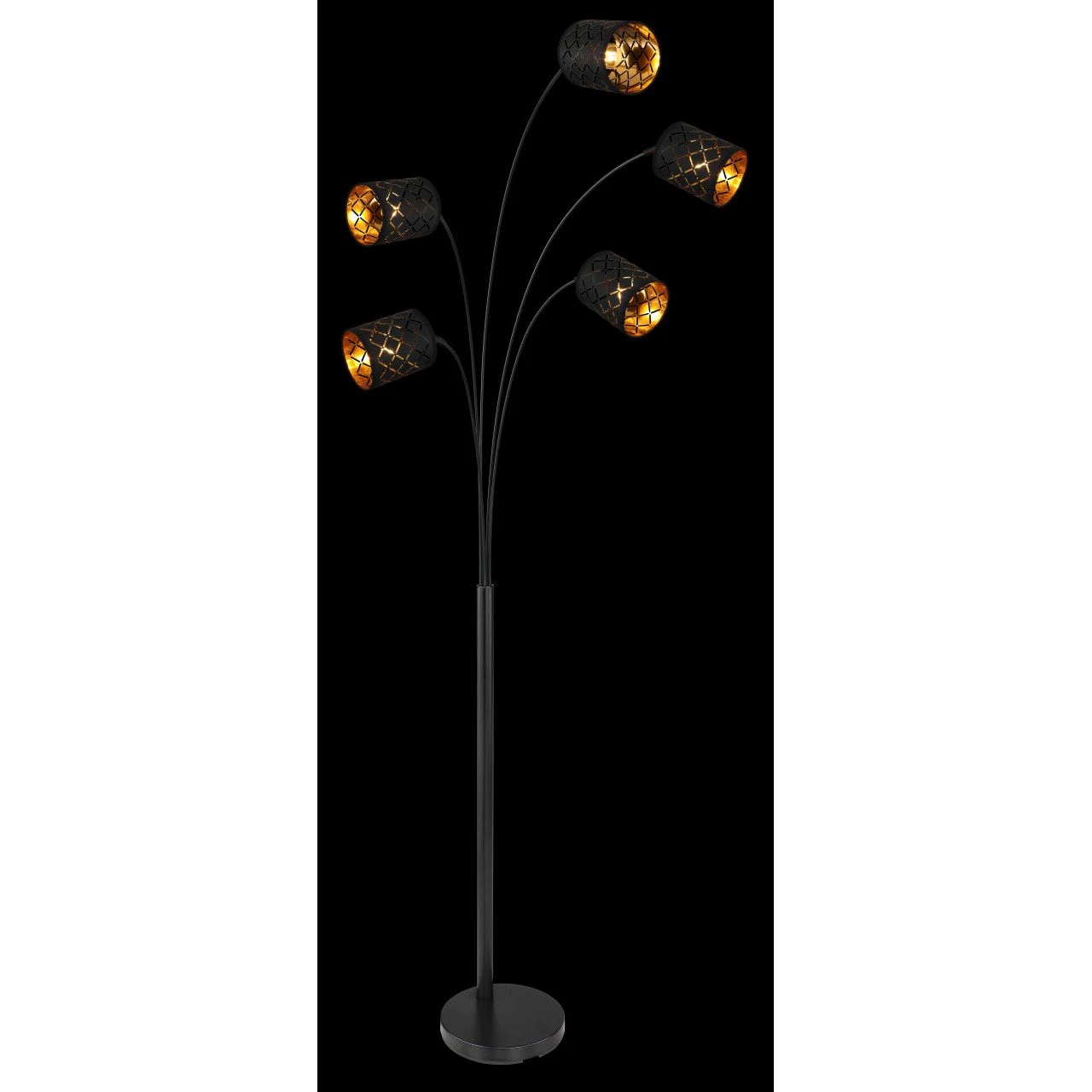 Stehleuchte Metall schwarz matt, Textil schwarz, Kunststoff goldfarben, Kabel 1,8m, Schirm mit Dekorstanzungen, Schalter, LxBxH:850×1300×2040, exkl. 5xE14 25W 230V