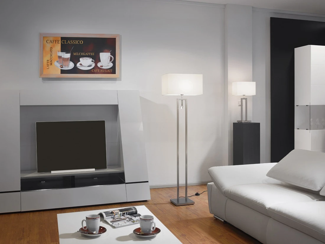 Eine Doppelrolle spielt diese elegante LED Stehlampe mit weißem Chintz-Stoffschirm, die sich in einem modernen Ambiente besonders wohlfühlt. Zum einen verteilt der kastige Lampenschirm ein angenehm diffuses Licht. Zum anderen befindet sich unterhalb dieser Hauptlichtquelle ein LED-Strahler. Dieser ist kippbar und ermöglicht einen individuellen Lichtaustritt für zum Beispiel gemütliche Lesestunden.