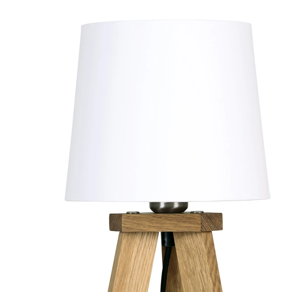 Der dreibeinige Fuß der Tischlampe besteht aus Holz, wahlweise in Nussbaum oder Eiche geölt. Vollendet wird das Design mit einem weißen Schirm aus Baumwolle.