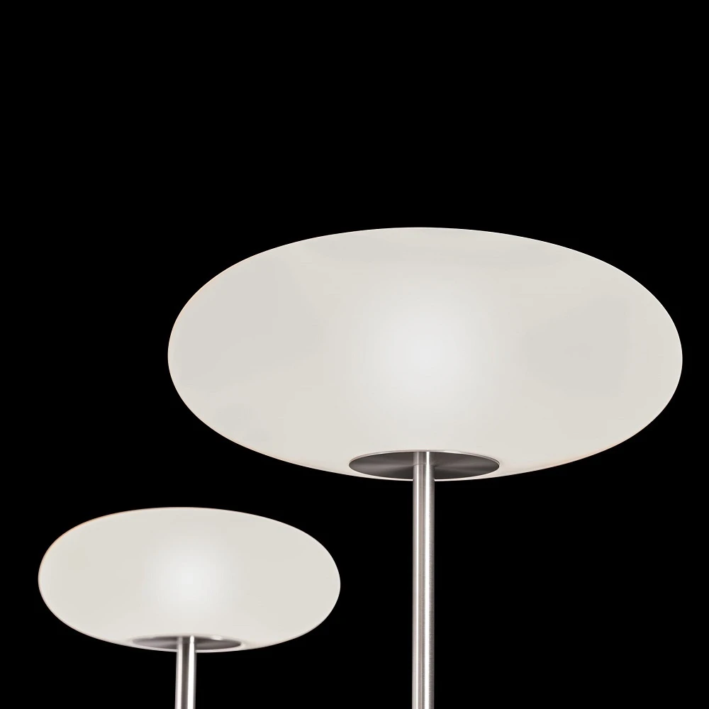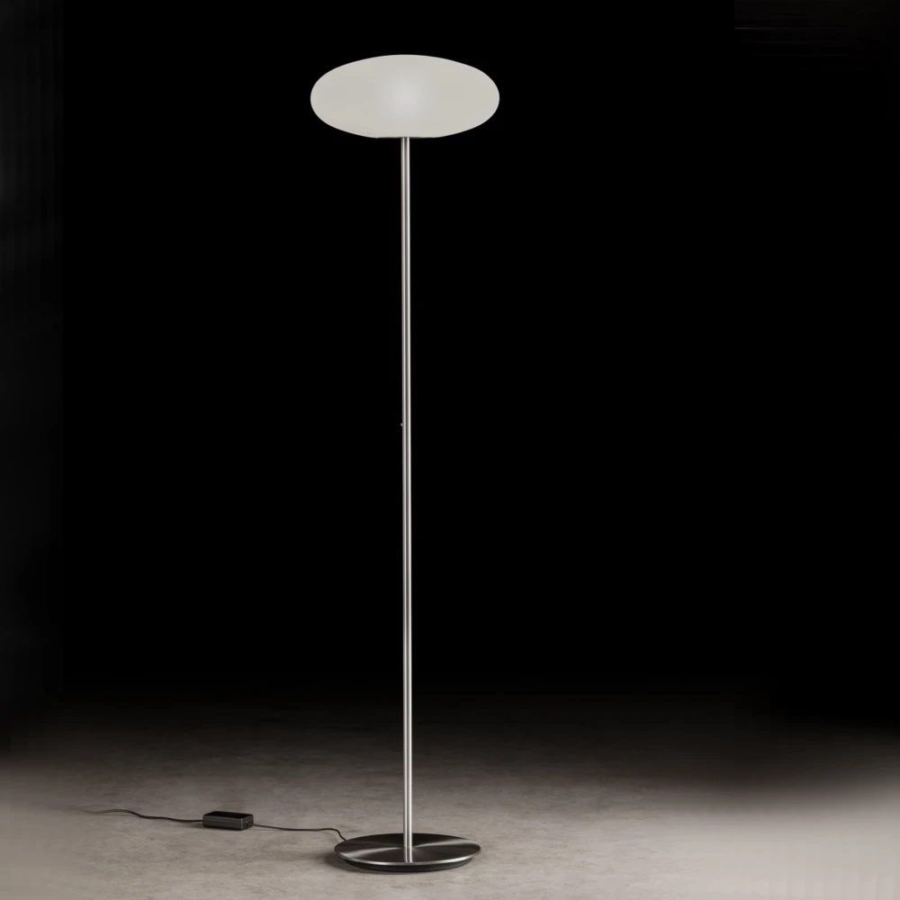 Auf einem dünnen Stab aus Metall, der in der zeitlosen Oberfläche Nickel-matt veredelt wurde, platziert sich das mundgeblasene Opalglas. Die Stehlampe ist in drei verschiedenen Größen erhältlich, das Glas passt sich jeweils der Höhe perfekt an.