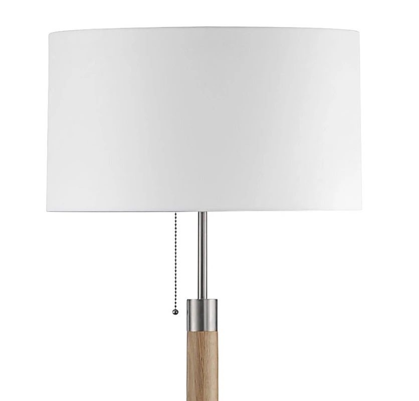 Diese moderne Stehleuchte ist geprägt von einem zeitlosen Design und dem Mix aus verschiedener Materialien. Ihr naturfarbener Holzstiel wird von Nickel-matten Elementen eingefasst und oben mit einem weißen Chintz-Schirm abgeschlossen. Der runde Fuß bietet Standsicherheit.