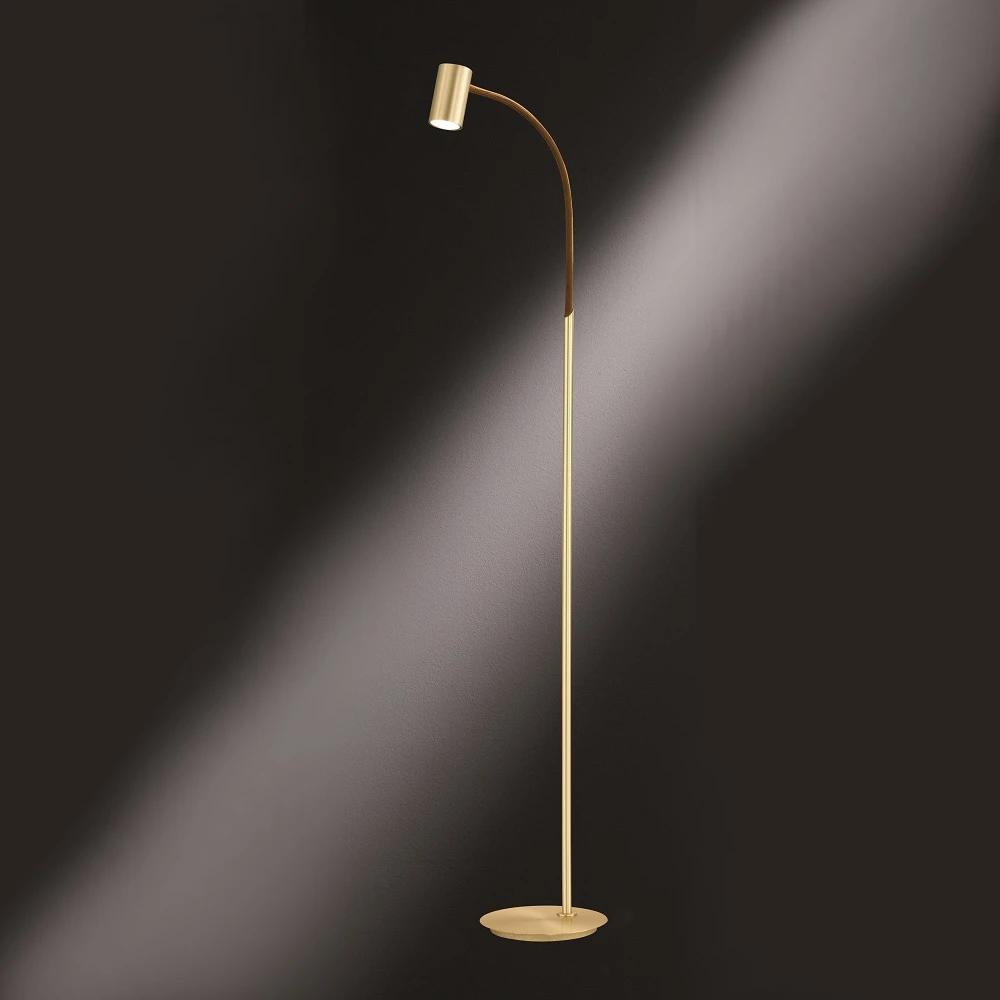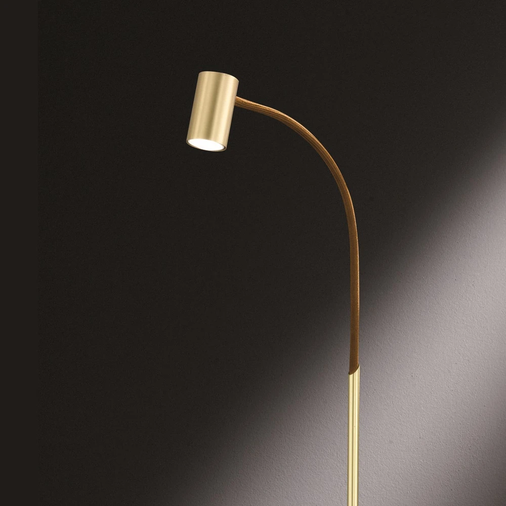 Von Kopf bis Fuß besteht ihr minimalistisches Design komplett aus einer Messing-matten Oberfläche, die passend mit einem goldfarbigen Flexschlauch abgerundet wird. Durch den Flexschlauch kann der Leuchtkopf der LED-Stehleuchte beliebig verstellt werden.