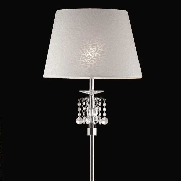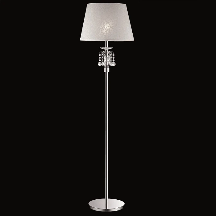 Eine charmante Stehleuchte mit floralem Leuchtenschirm, deren funkelnde Elemente verspielte Eleganz in den Raum bringt. Das Metallgestell ist glänzend verchromt, der Lampenschirm ist aus feuersicherer Acrylfolie, der Bezug ist zart durchscheinend mit floralem reliefartigem Print. Schale und Glasprismen aus geschliffenem Kristall sorgen für einen facettenreichen Glanz.