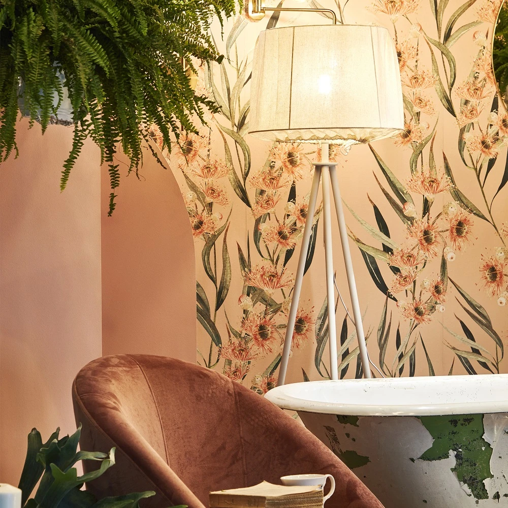 Ein runder , 40cm Leuchtenschirm aus Leinen macht die Leuchte komplett.