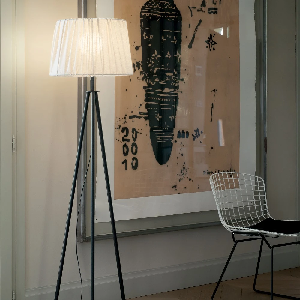 Die Standleuchte Fit besteht in der Basis aus matt lackiertem Metall.