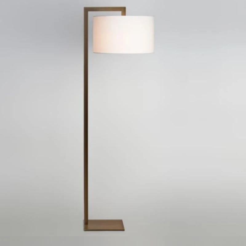 Drei Farbnuancen werden für den Leuchtenschirm angeboten, die Oberfläche des modern geformten Standrohres ist bronzefarben. Die Leuchte wird über einen Schnurzwischenschalter geschaltet.