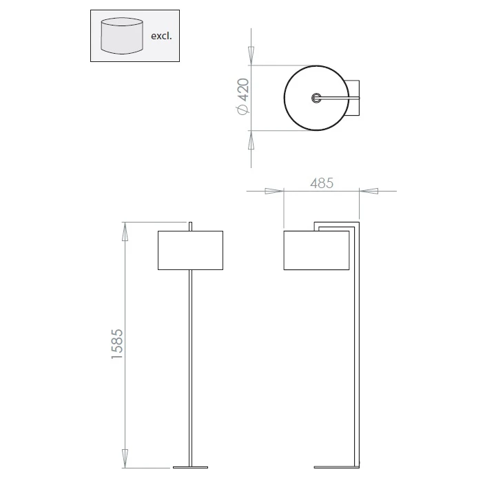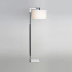 Drei Farbnuancen werden für den Leuchtenschirm angeboten, die Oberfläche des modern geformten Standrohres ist glänzendes Chrom. Die Standleuchte wird über einen Schnurzwischenschalter geschaltet.