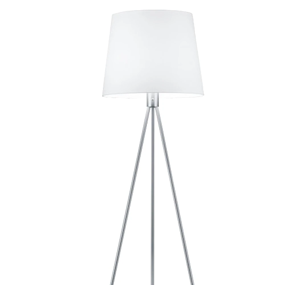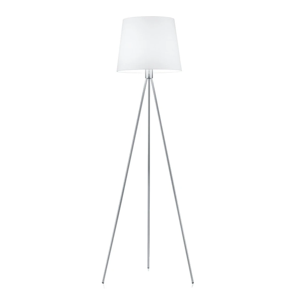 Dreibeinige Stehleuchte mit weißem, konischen Chintzschirm und Tastdimmer von Knapstein Leuchten