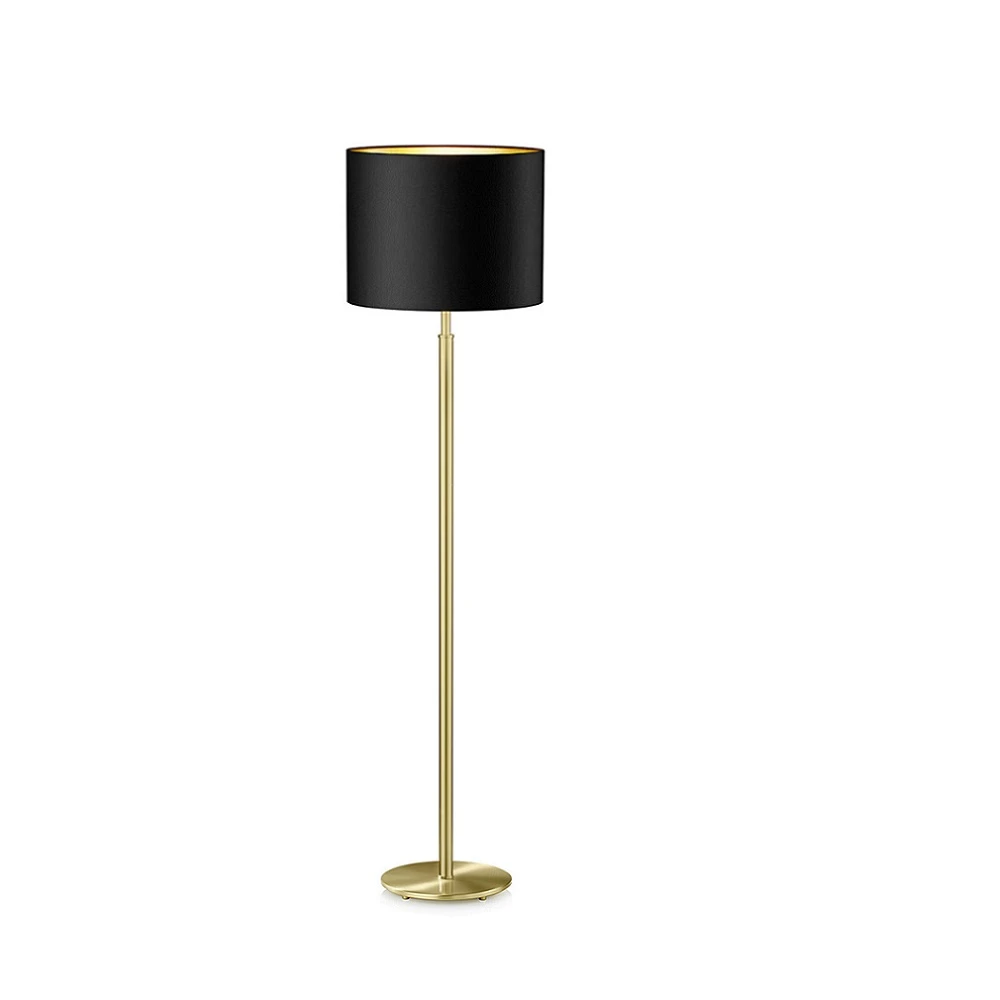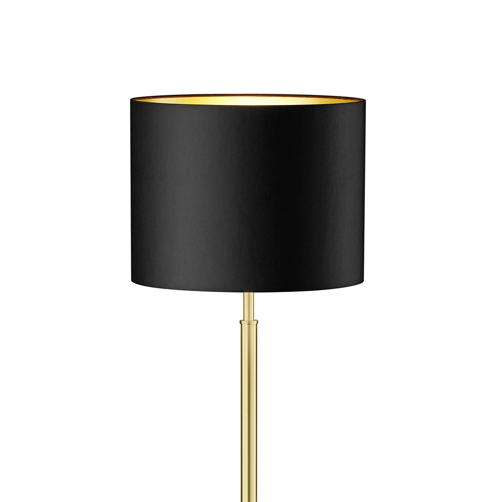 Klassische Stehleuchte in Messing-matt mit schwarzem Chintzstoffschirm mit goldener Beschichtung