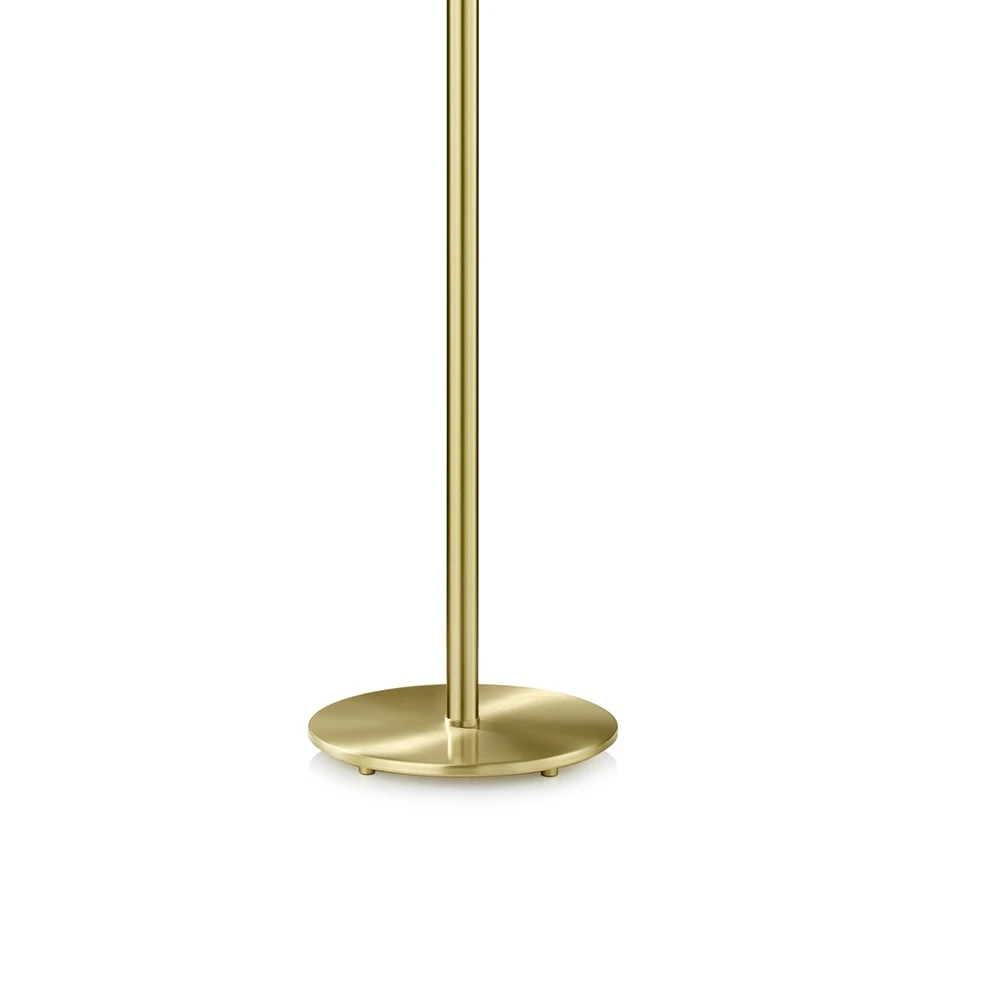 Die Stehleuchte von der Firma Knapstein wird aus purem Messing gefertigt und glänzt mit einem Chintzschirm, welcher von innen goldbeschichtet ist. Durch ihren schwarzen, oben offenen Schirm lässt sie das Licht diffus in den Raum leuchten und gleichzeitig an die Decke strahlen. Sie wirkt edel und hat zugleich Gemütlichkeitspotenzial.