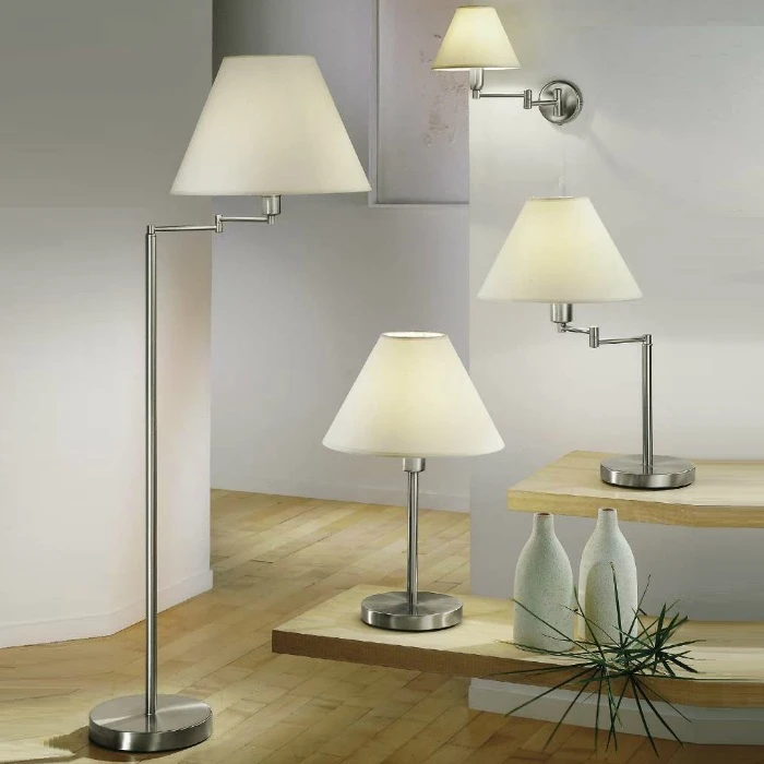Gestaltet wurde sie aus einem Leuchtenfuß in Nickel und einem dezent weißen Stoffschirm. Mit einer Höhe von 30cm verbirgt der Schirm eine E27-Fassung für maximal 60W. Durch den Stoff ist der Lichtschein angenehm blendfrei für eine entspannte Lichtatmosphäre.
