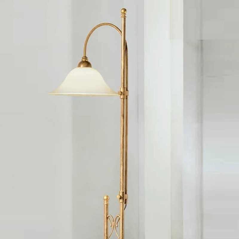 Der Leuchtenkorpus zeigt seine Wertigkeit in Messing-antik und verbindet sich mit hochwertigen Scavogläsern in Creme. Dezente Zurückhaltung, die ins Auge fällt.