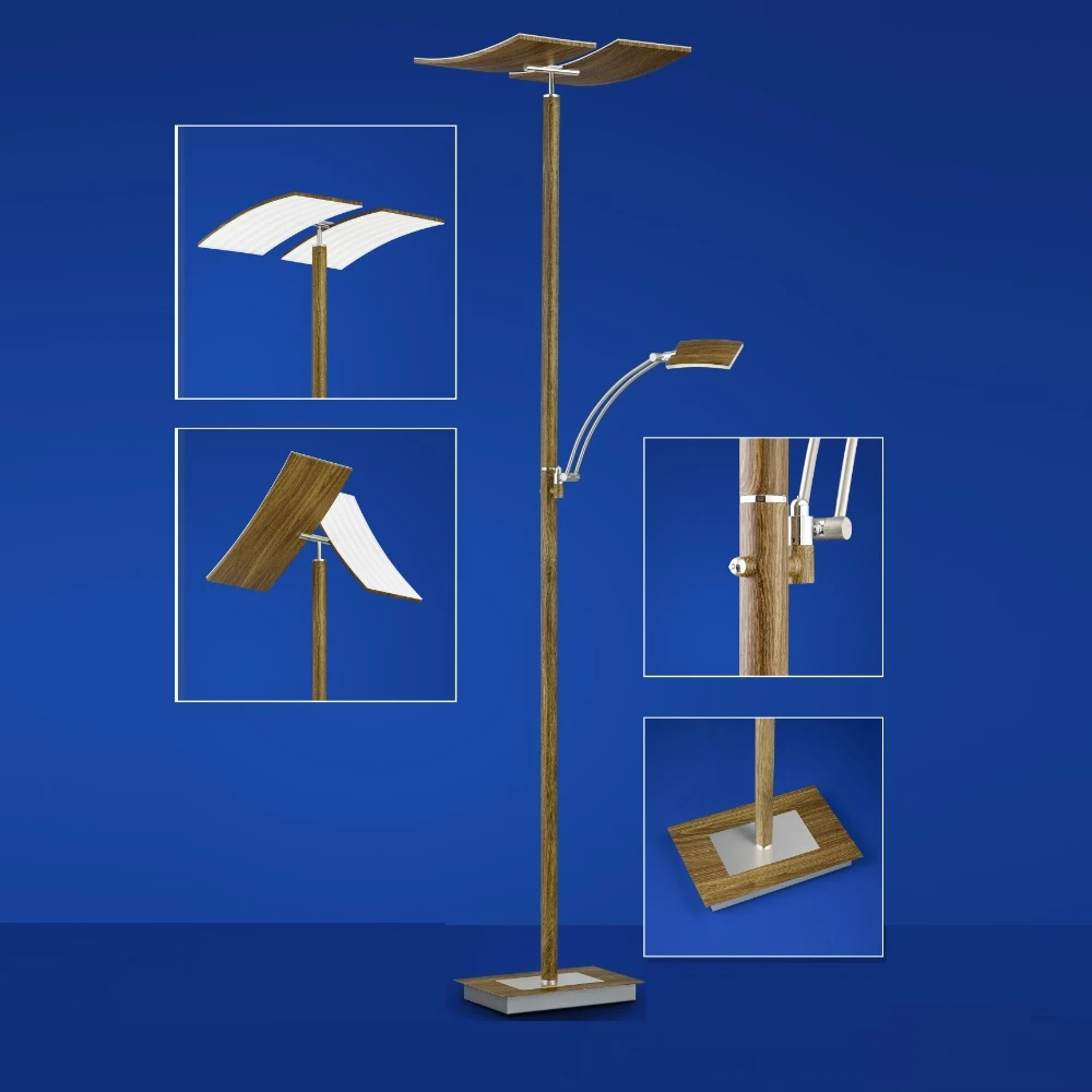 Die Stehlampe verfügt über Tastdimmer am Standrohr, einen für das Fluterlicht und einen für den Leuchtenkopf am Lesearm. Hiermit wird das Dimmen der Helligkeit ermöglicht und das schalten beider Lichtquellen getrennt regelt. Die Memoryfunktion bringt die angewählte Beleuchtung beim erneuten Einschalten hervor. Durch satiniertes Acrylglas geschützt, sorgen die LEDs für blendfreies, homogenes Licht, die Lichtfarbe ist angenehm warmweiß.