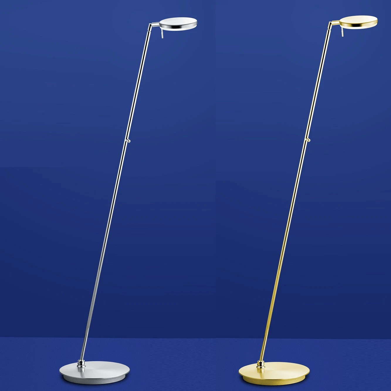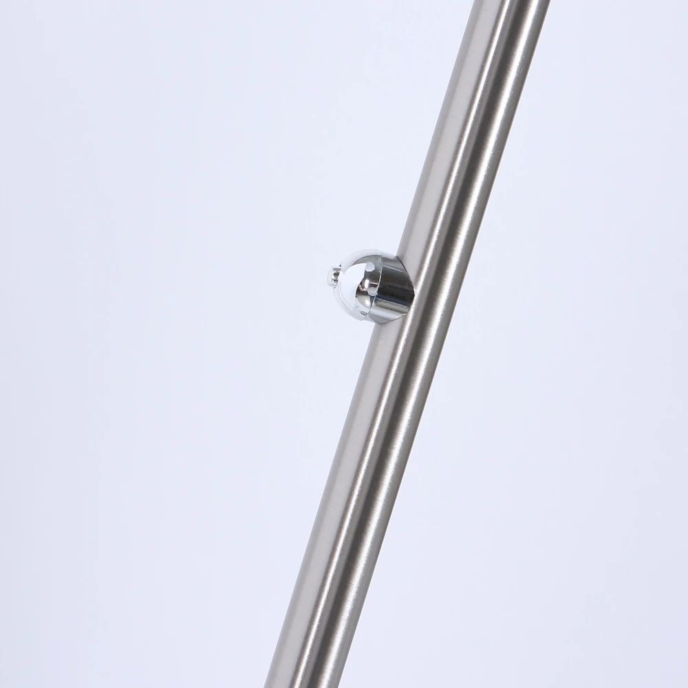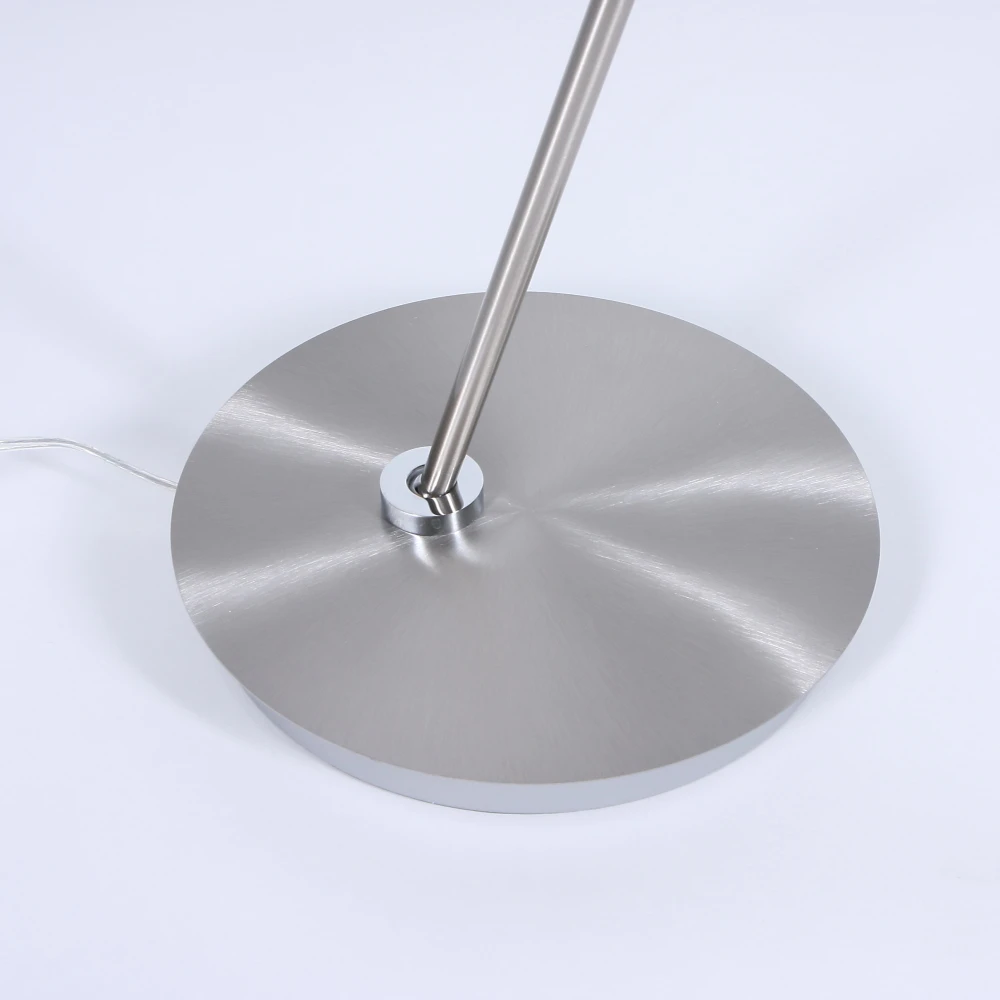 Der runde Leuchtenkopf ist einseitig mit LEDs bestückt, die von einem weißen Acrylglas abgedeckt werden. Ein verstellbares Gelenk verbindet den Leuchtenkopf mit einem leicht schräg platzierten Leuchtenstab, der ebenso mit einem verstellbaren Gelenk mit dem runden Leuchtenfuß verbunden wurde. Durch die vielen Verstellmöglichkeiten ermöglicht die LED-Stehleuchte eine gerichtete, optimale Lichtverteilung.