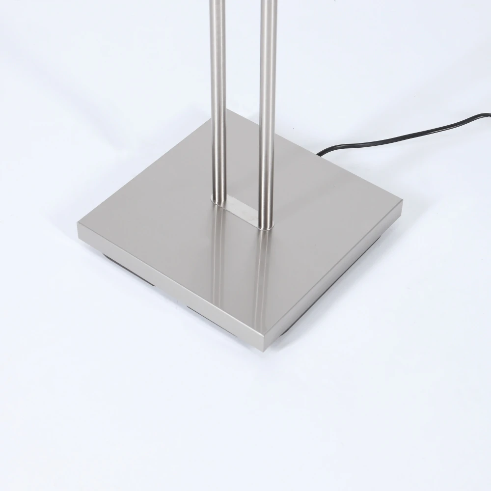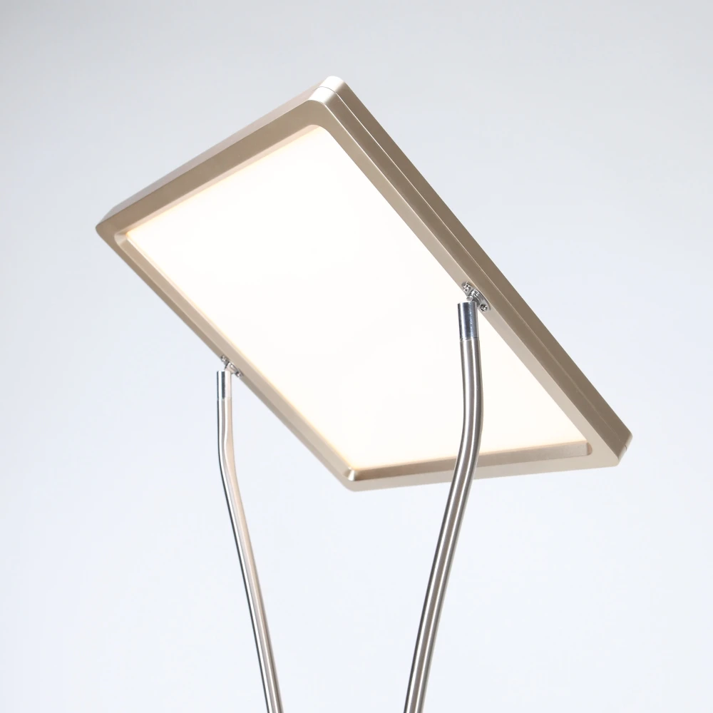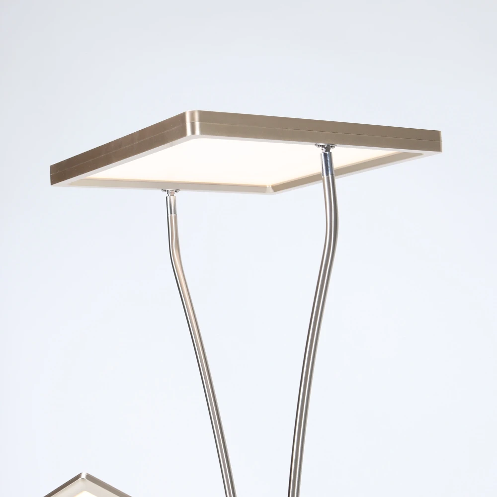 Diese moderne LED-Stehleuchte besteht aus einem quadratischen Standfuß, dem schwenkbarem Fluterelement und einem Lesearm.