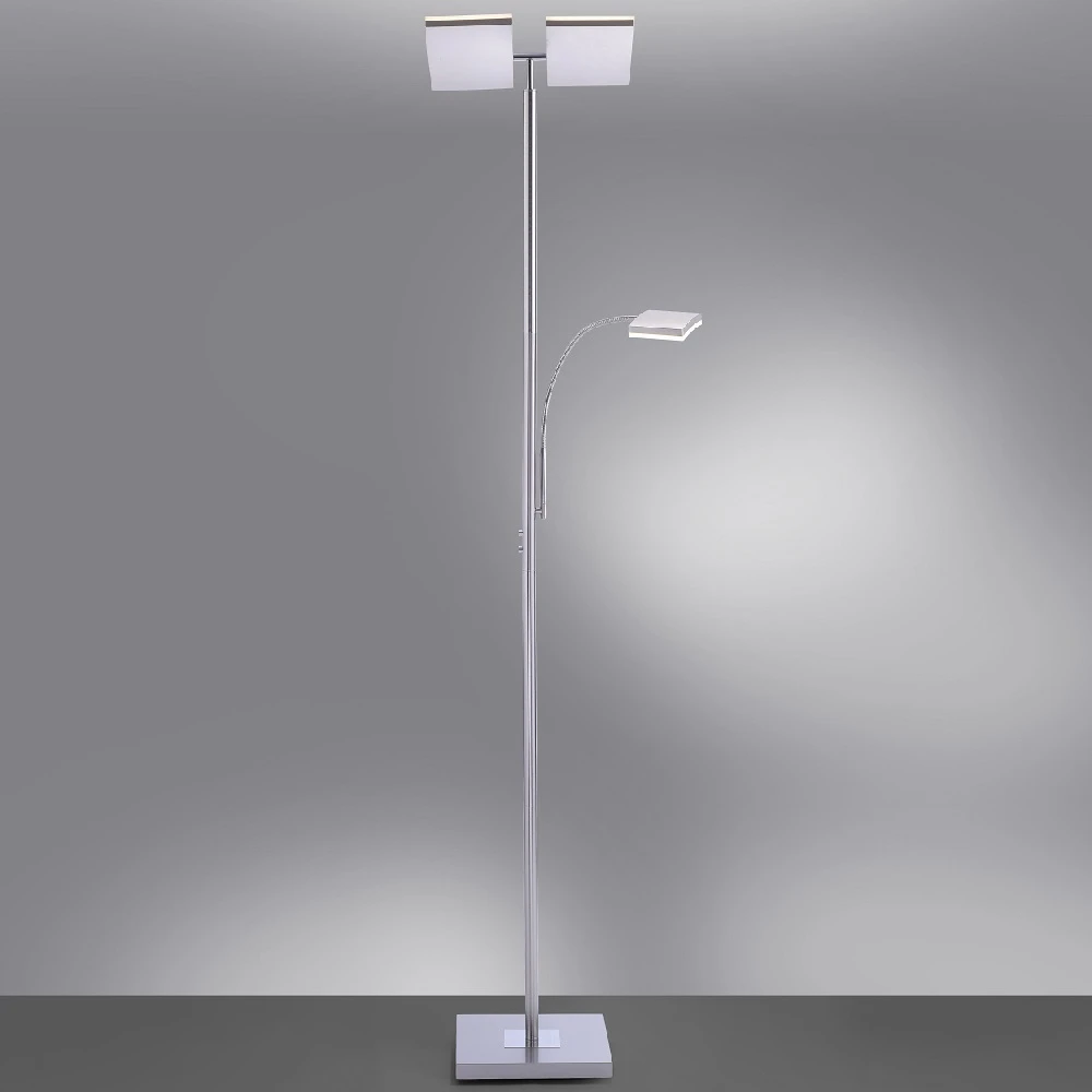 Der moderne Deckenfluter Ruben begeistert mit seinen Funktionen. Die Stehleuchte verfügt über einen Fluterkopf und eine Leseleuchte. Diese sind getrennt voneinander schaltbar.