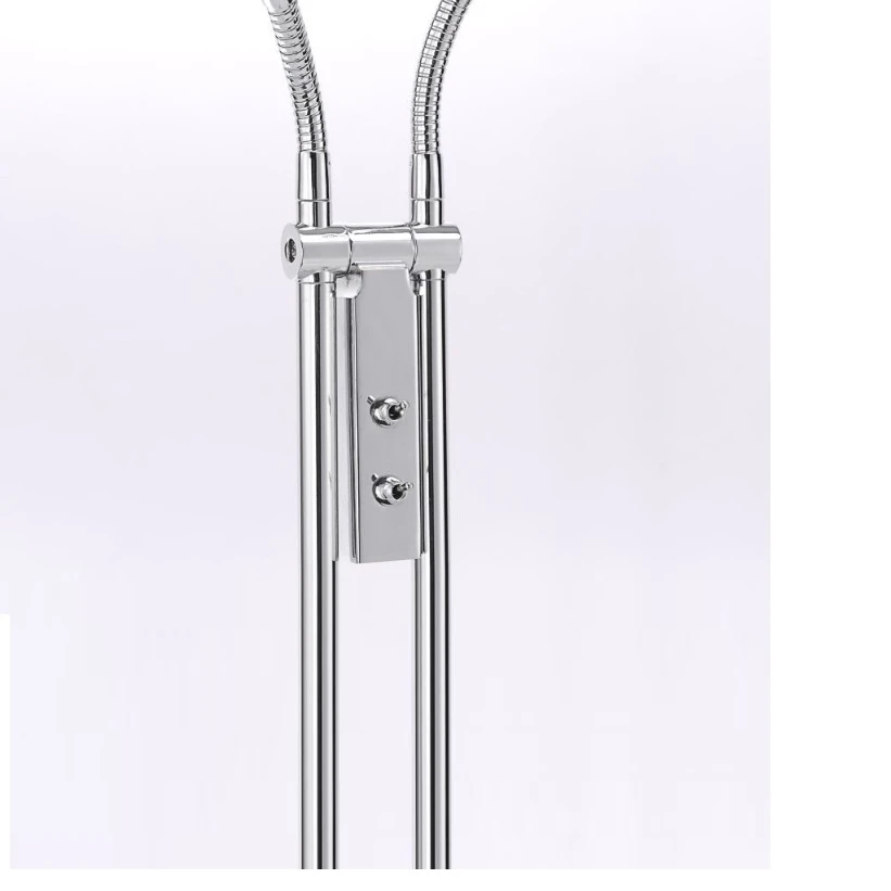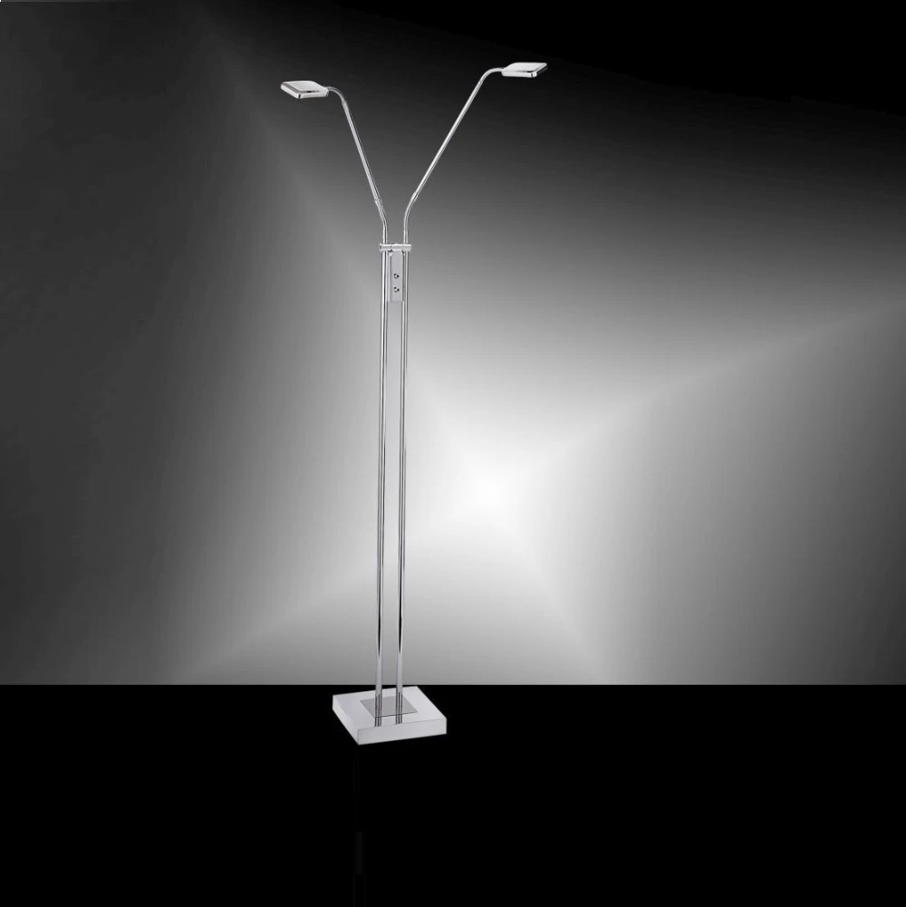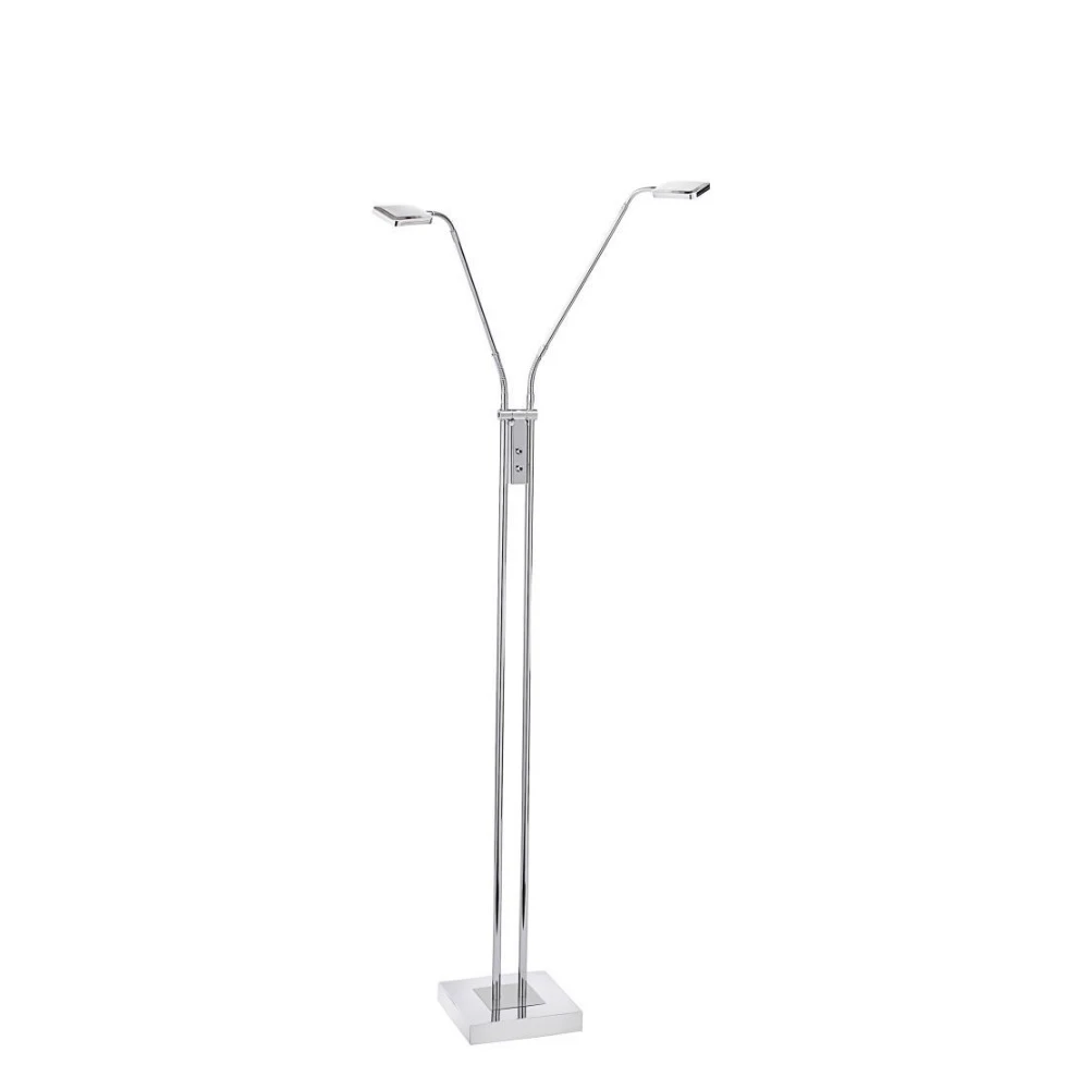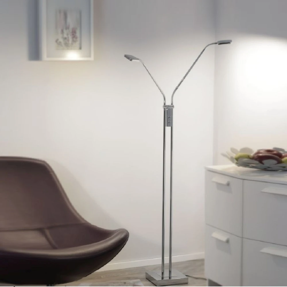 Elegant und modern zugleich: Die chromfarbene Stehleuchte besticht durch ihr beeindruckendes Design. Sie ist mit zwei flexiblen Leuchtarmen ausgestattet, sodass Sie den Lichteinfall nach Ihrem Belieben einstellen können. Zudem haben Sie die Möglichkeit durch zwei Kippschalter die beiden Leuchtenarme getrennt zu schalten. Die schlichte Stehlampe ist mit zwei festverbauten LED-Leuchtmittel ausgestattet und sorgt mit ihrer warmweißen Lichtfarbe für eine gemütliche Wohlfühlatmosphäre. Durch die mattierten Kunststoffscheiben über dem Leuchtmittel gibt Sie ein angenehmes, blendfreies Licht ab. Dank der verwendeten LED-Technik zeichnet sich die Leuchte als äußerst energiesparend aus und überzeugt dabei mit einer geringen Wärmeentwicklung sowie hohen Lebensdauer. Holen Sie sich die moderne Stehleuchte in Ihre vier Wände und erleben Sie ein wunderbares Leuchterlebnis!
