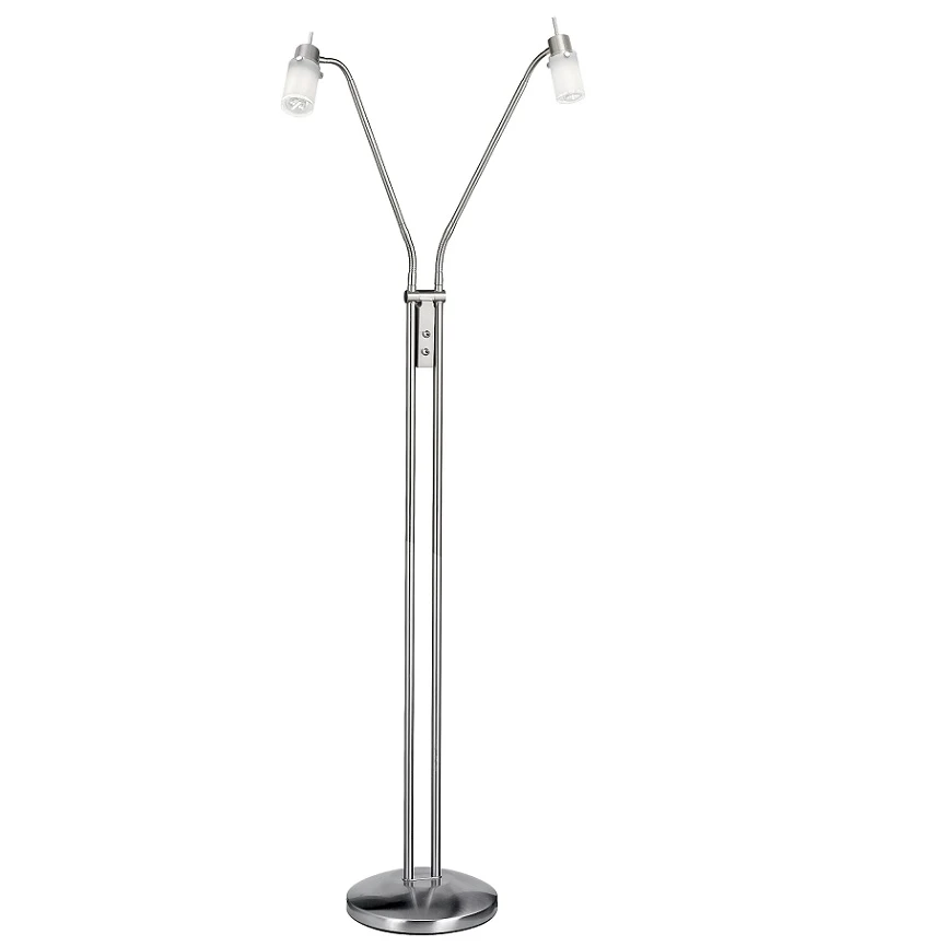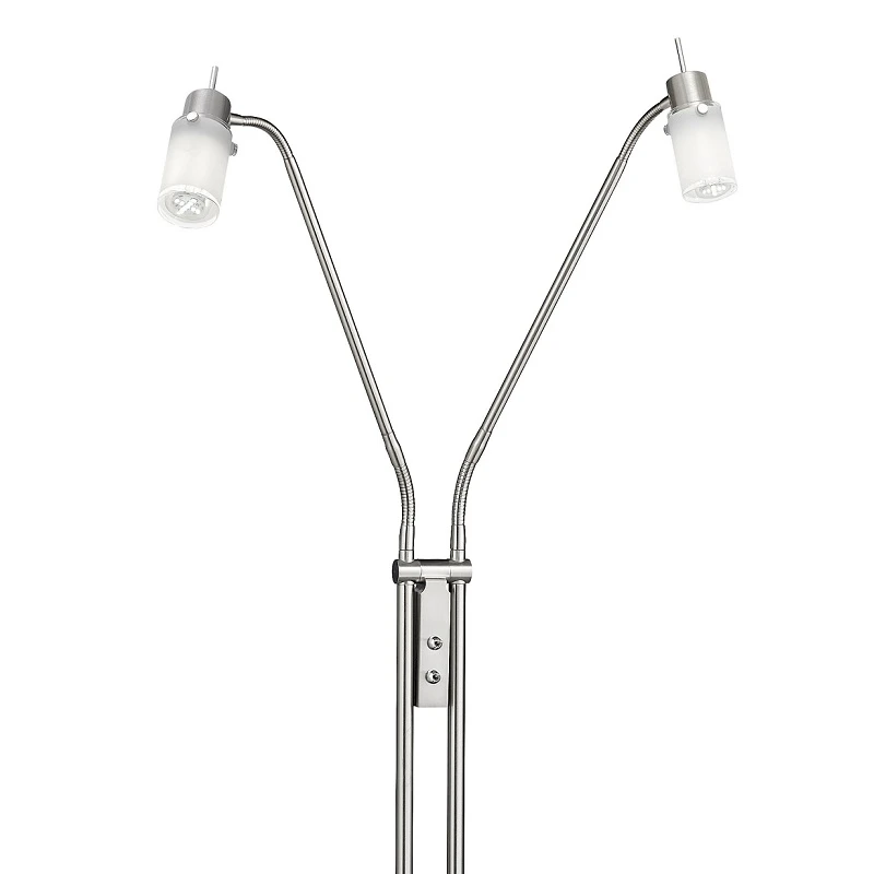 Klassische Strahlerserie mit zukunftsorientiertem Inhalt. Längst in der Zukunft angekommen, sind auch Strahlerserien. Klassische Formgebung und Funktionalität verbinden sich mit moderner Technologie. Die 2-flammige Stehleuchte ist bestückt mit 2 LED-Leuchtmitteln à 4 Watt. Der niedrige Energie- verbrauch wird sich auch in Ihrem Geldbeutel bemerkbar machen. Die Energieersparnis beträgt ca. 89%. Das warmweiße Licht verbreitet eine angenehme Atmosphäre und kann gerichtet werden, da die Strahler schwenkbar sind und die Leuchte mit 2 praktischen Flexarmen ausgestattet ist. Ausgerüstet mit 2 separaten Schaltern, können Sie die Leuchtenarme getrennt voneinander schalten.