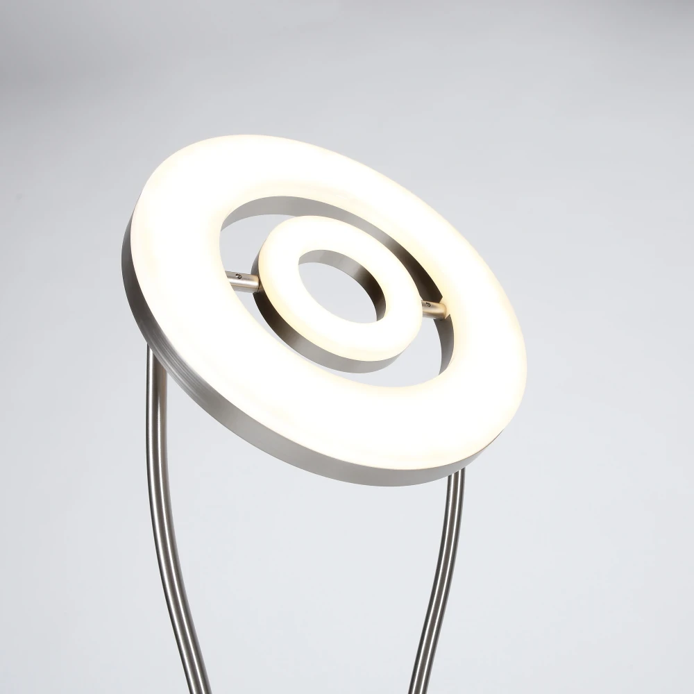 Herzstück ist der der runde Deckenfluter, der zweigeteilt ist: Der große Außenring strahlt ein helles Licht indirekt in den Raum als Allgemeinbeleuchtung; der Innenring ist schwenkbar und kann in jede beliebige Richtung gedreht werden.