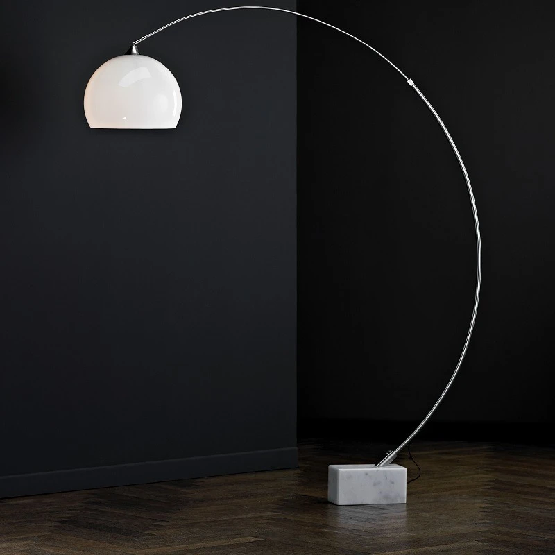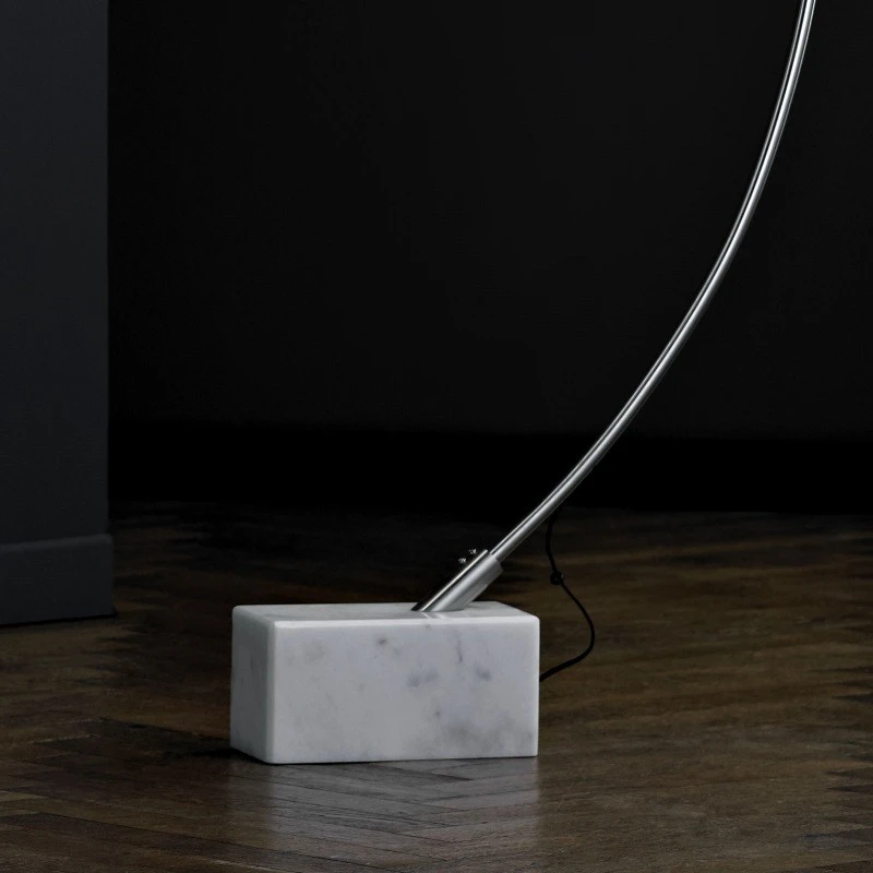 Elegant und standsicher schwinkt der Bogen an einem schweren Marmorfuß, durch die rechteckige Bauform vom Leuchtenfuß lässt sich für die Leuchte schnell der ideale Platz finden. Dank des maximal auf 170cm verlängerbaren Auslegers löst die Leuchte in einfacher und eleganter Weise fast jede Beleuchtungsaufgabe.