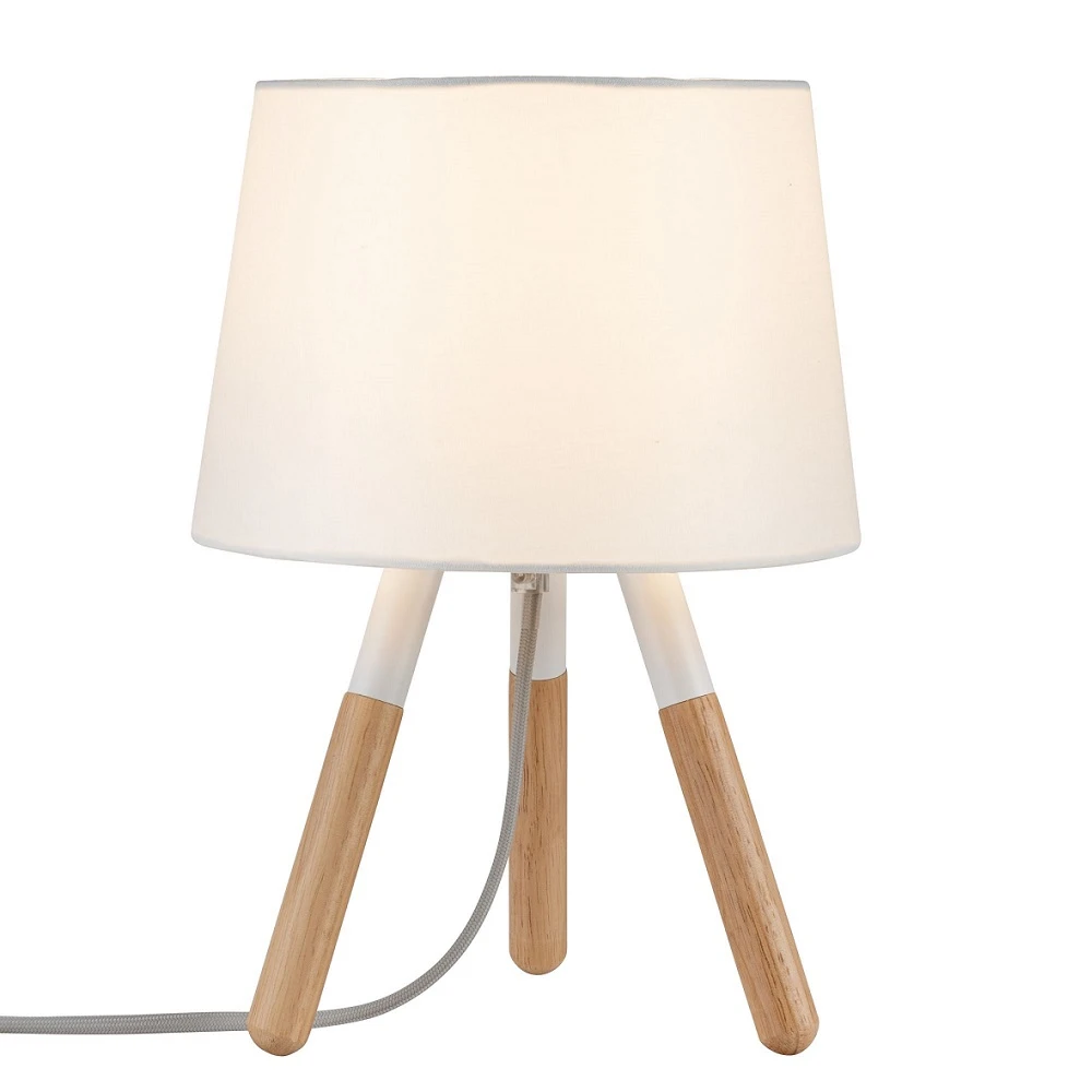 Ein gelungener Materialmix zeichnet die handgefertigte Tischleuchte aus. Die weißen Metallbeine werden durch Echtholz veredelt. Der weiße Schirm aus Stoff rundet das Design gekonnt ab.