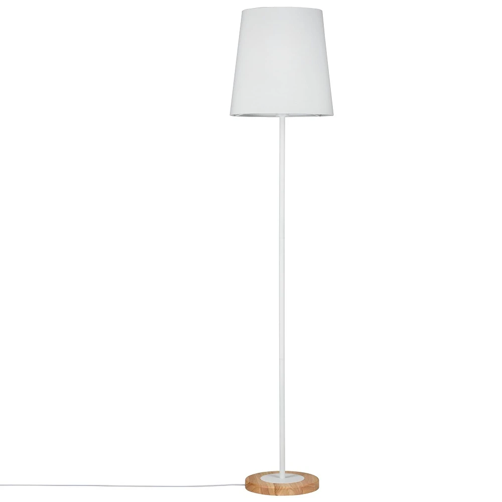 Von dem runden Holzfuß der Leuchte ragt weißer Metallstab in die Höhe. Auf diesem befindet sich ein weißer Stoffschirm, der das Arrangement gelungen abrundet.