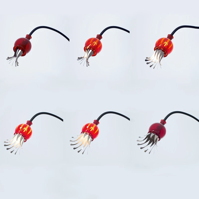 Werden die ‘‘Mohnblüten‘‘ dieser Leuchte durch Einschalten geweckt, öffnen sich ihre Schirme ganz allmählich innerhalb 2 Minuten: dafür verantwortlich sind die feinen Blätter aus Bi-Metall, die sich durch Erwärmung des Leuchtmittels in eine vorgegebene Richtung ausdehnen. Ihre Knospe, der kelchartige Schirm aus mundgeblasenem Glas erhält durchleuchtet eine feine Transparenz.