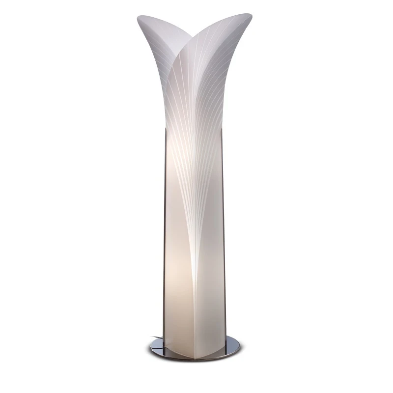 Einzeln als Tischleuchte, Stehleuchte oder in einer Gruppe arrangiert, fallen sie durch hochwertige Verarbeitung und einem interessanten Design, ähnelnd der Form eines Palmenblattes, auf. Das weiße, zart gemusterte Material und die aparte Form versprechen ein behagliches und diffuses Licht.