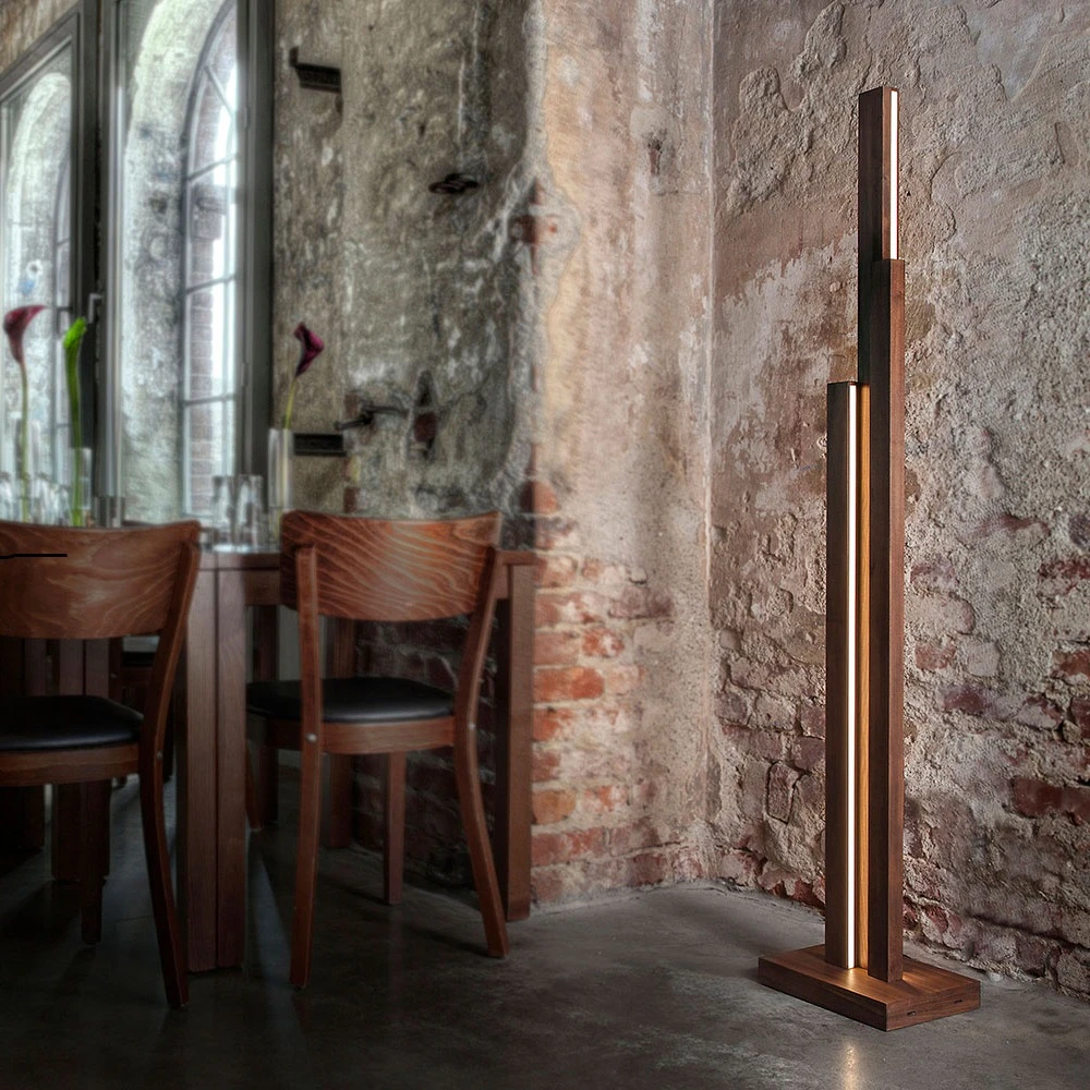Die unterschiedlich hohen Holzsäulen symbolisieren die Silhouette der Wolkenkratzer und gelten als charakteristisches Merkmal der Leuchtenfamilie Soho.