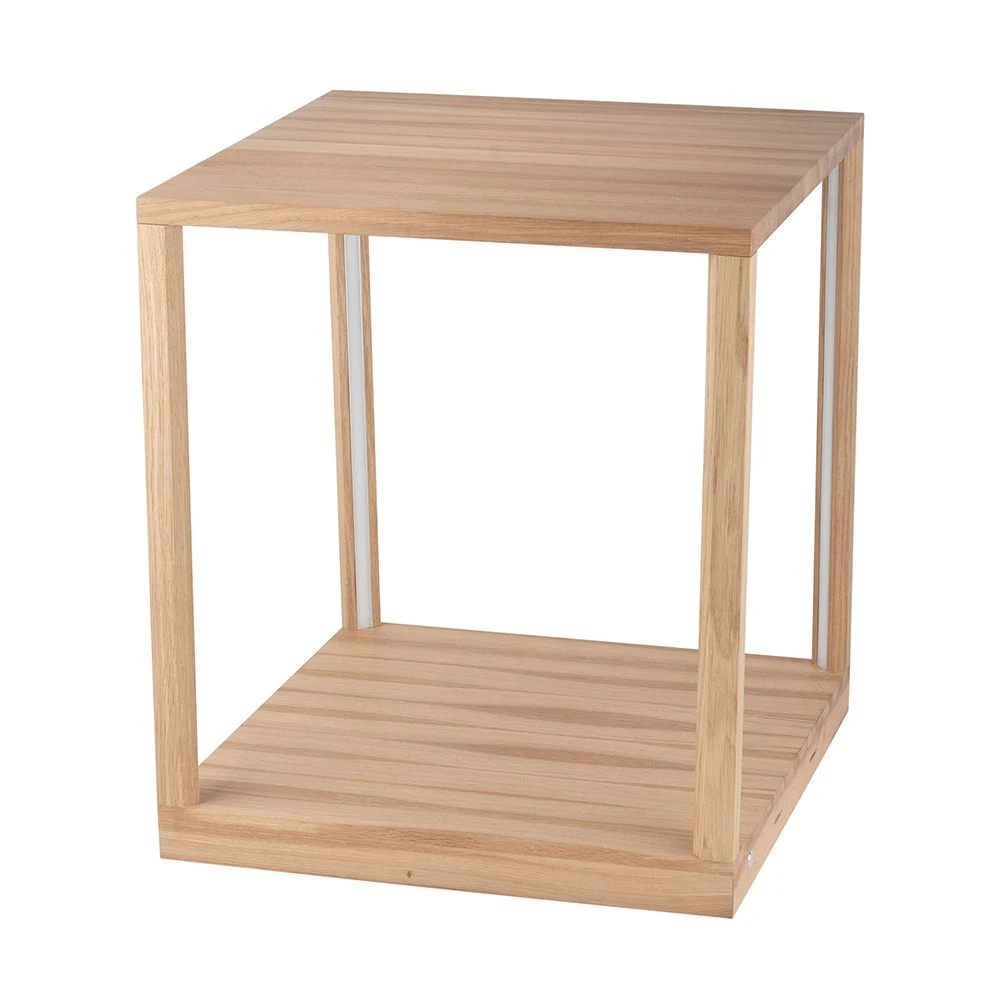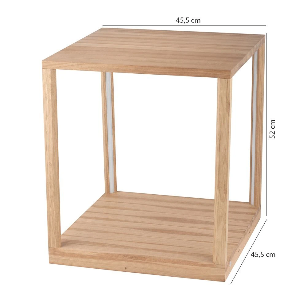 Dieses Produkt verbindet einen Beistelltisch mit einer Stehleuchte zu einem ganz besonderen Accessoire in Ihrem Wohnraum. Der beleuchtete Beistelltisch wurde aus Eichenholz gefertigt und mit einer Tischplatte aus Glas versehen. Die Leuchte ist mit einem LED-Modul von 27 Watt ausgestattet. Die Maße dieser Stehleuchte betragen 45,5×45,5×52 cm.