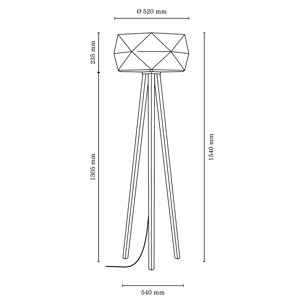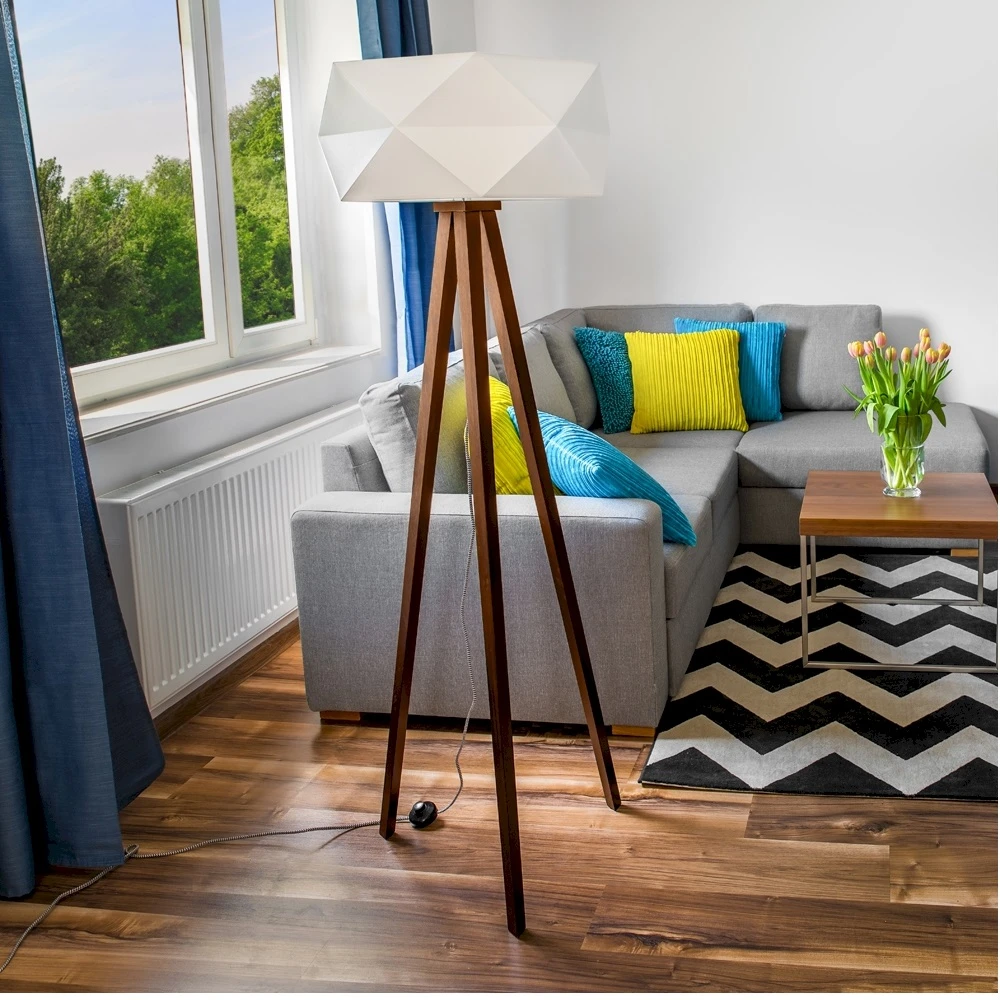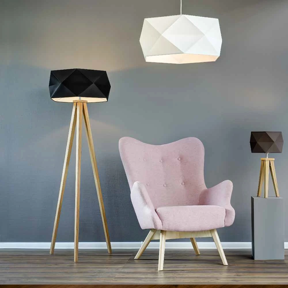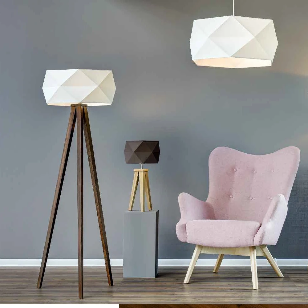 Das helle, warme Licht, das sanft durch den Stoff des Schirms dringt, bringt Wärme, Ruhe und Harmonie in den Raum. Der effektvolle, hölzerne Dreifuß bildet eine perfekte Ergänzung zu diesem geometrischen Design.