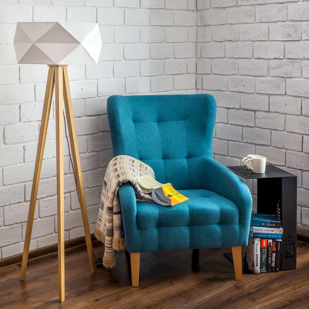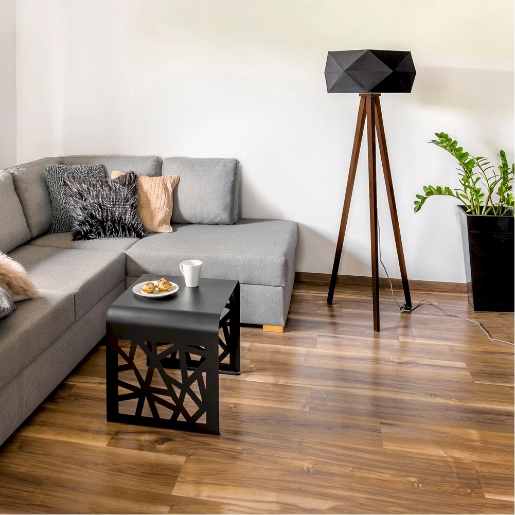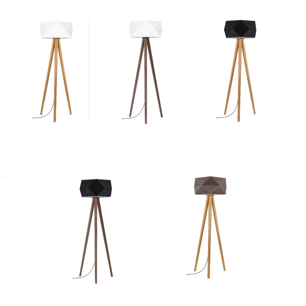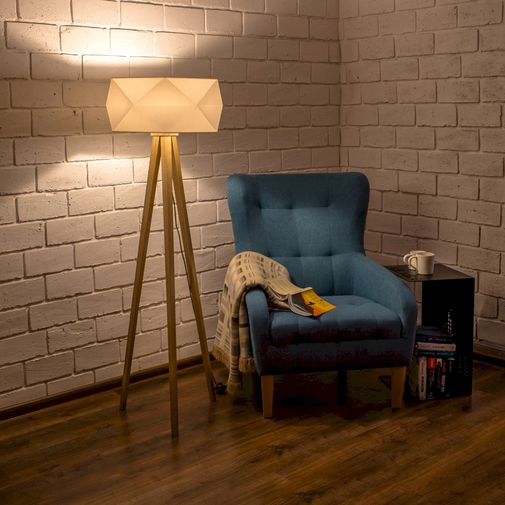 Das helle, warme Licht, das sanft durch den Stoff des Schirms dringt, bringt Wärme, Ruhe und Harmonie in den Raum. Der effektvolle, hölzerne Dreifuß bildet eine perfekte Ergänzung zu diesem geometrischen Design.