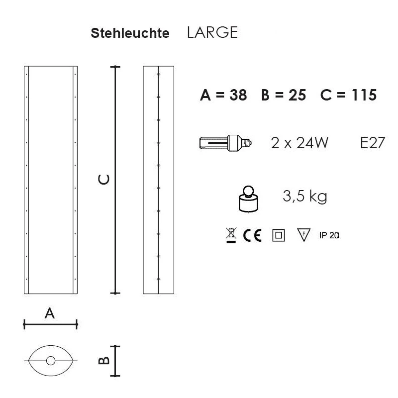 - Stehleuchte Large: Höhe: 115cm – 38cm x 25cm – Leuchtmittel: 2x E27 75W