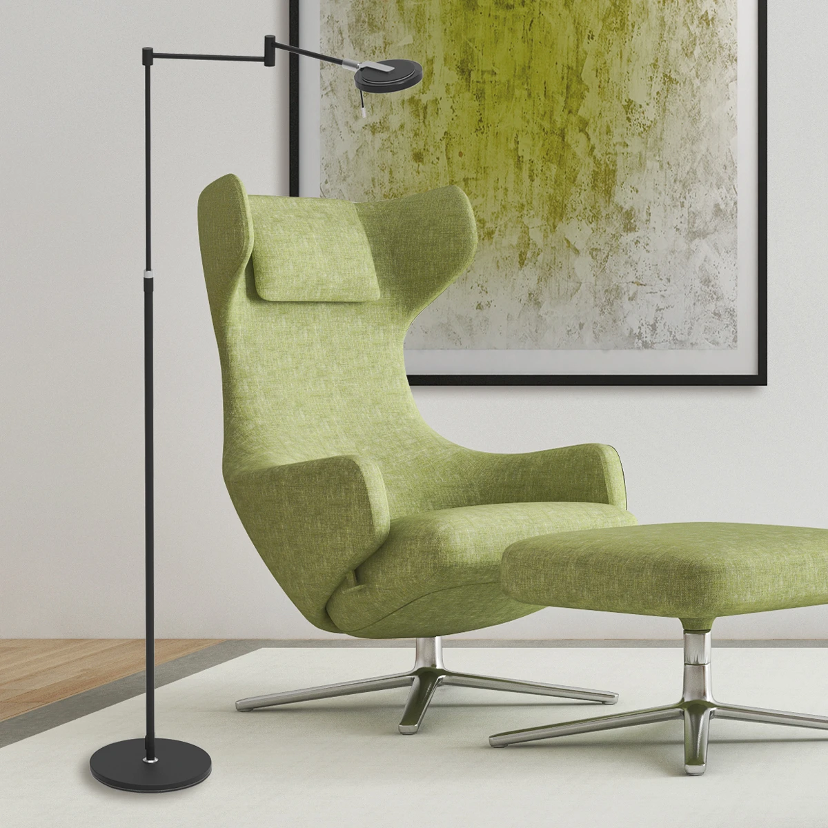 Moderne Stehleuchte mit schwenkbaren Lesearm zum entspannten Wohnen. Die Stehleuchte hat ein schlichtes Design. Das Licht kommt durch Glasscheiben besonders schön zur Geltung. Eine ausgefallene und stylische Wohnleuchte mit der Sie immer im richtigen Licht sitzen.
