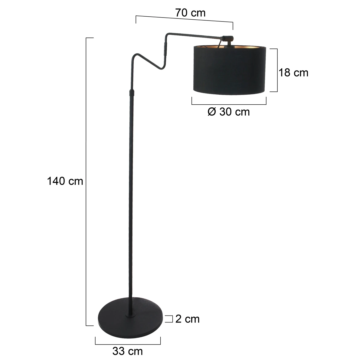 Die Lampe besteht aus Metall und ist schwarz pulverbeschichtet. Die Höhe der Lampe ist von 140 bis 180 Zentimeter einstellbar und der Bereich beträgt 95 Zentimeter, einschließlich eines 250-Zentimeter-Kabels mit Fußschalter. Der Schirm ist schwarz.