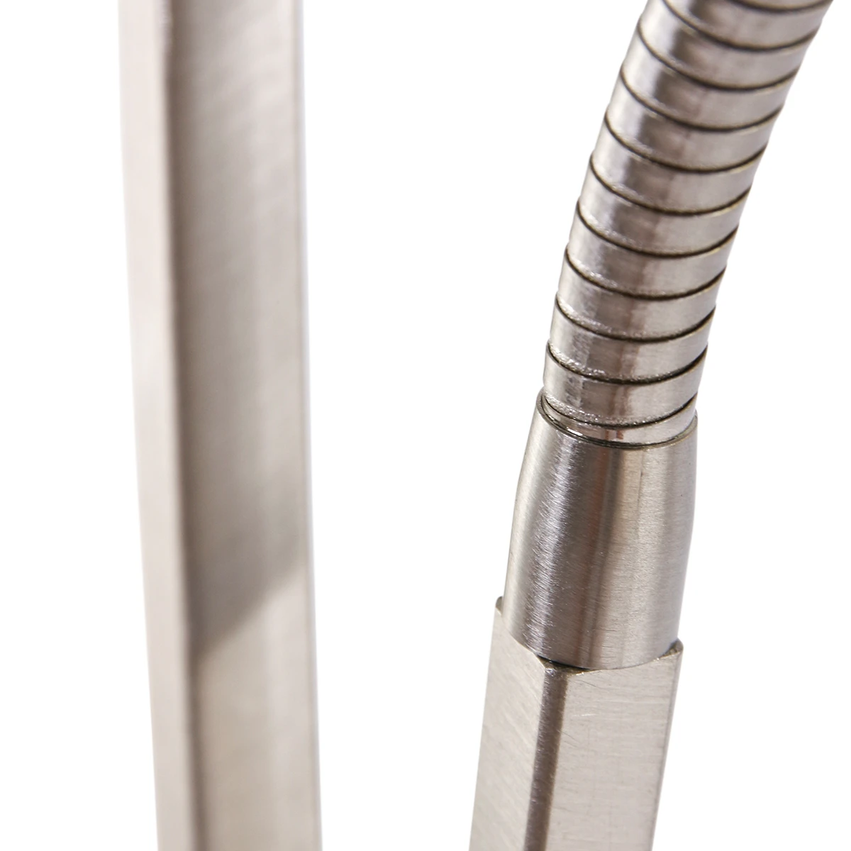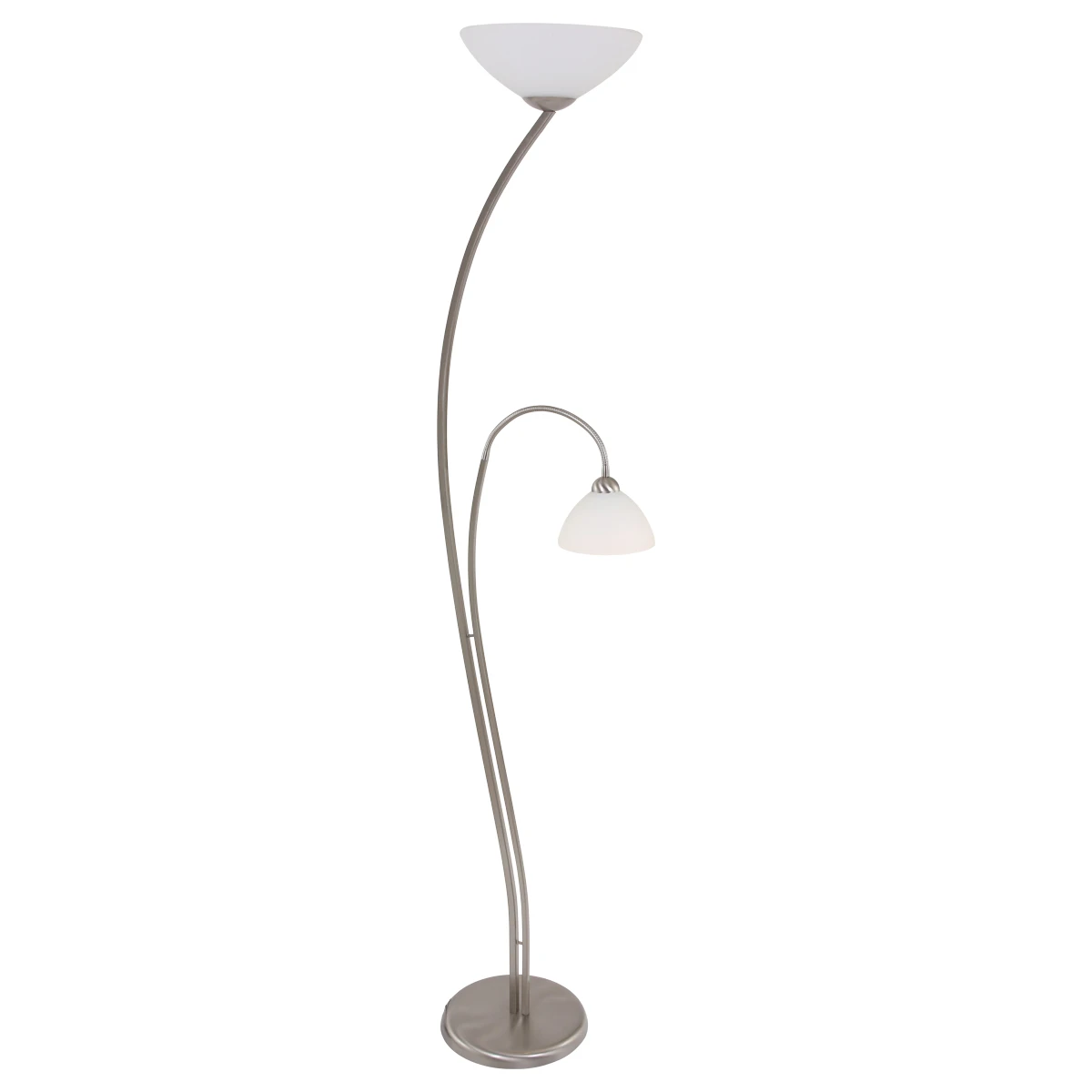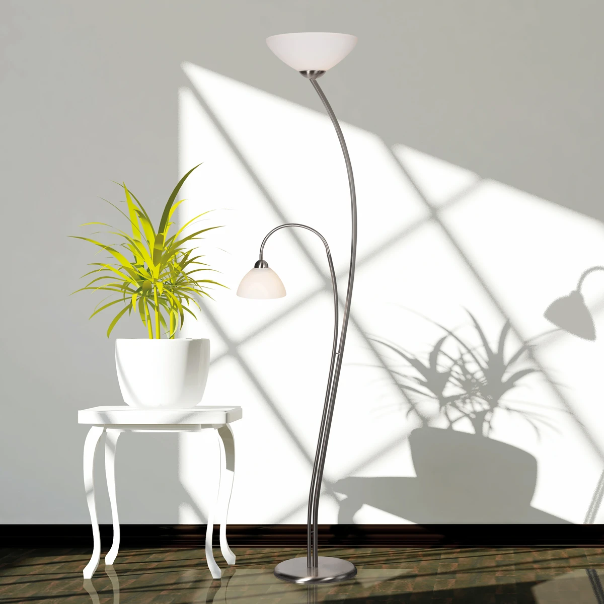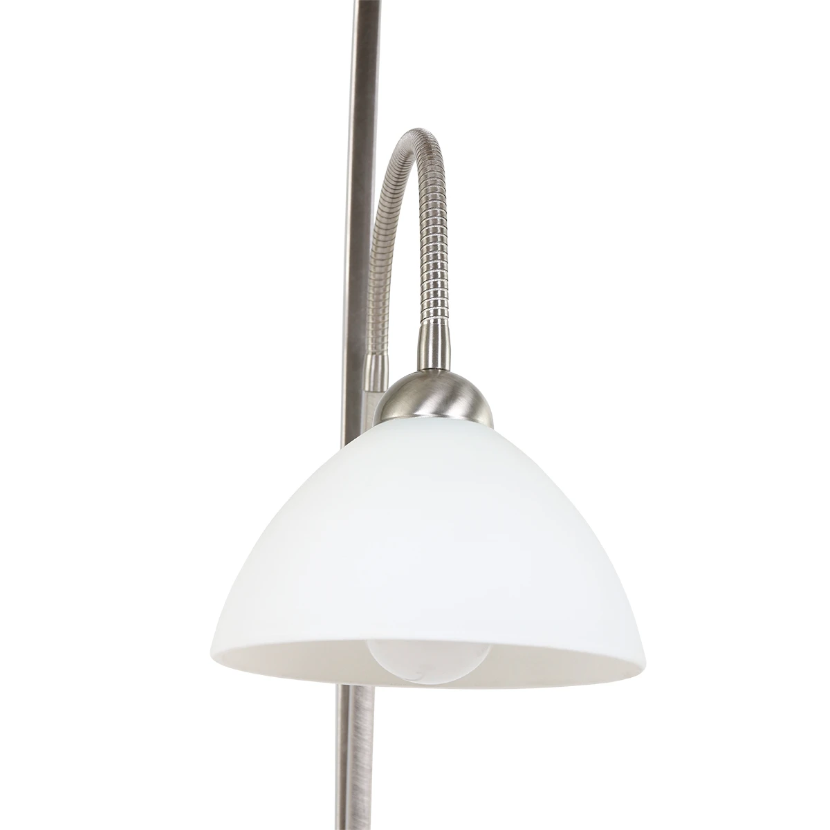 Eine klassische Stehlampe mit Lesearm, die auch in einem modernen Interieur zur Geltung kommt. Die gebürsteten Stahlrohre halten das matte Opalglas an Ort und Stelle. Die Stehlampe ist mit 2 E27-Anschlüssen und einem im Kabel integrierten Dimmer ausgestattet.