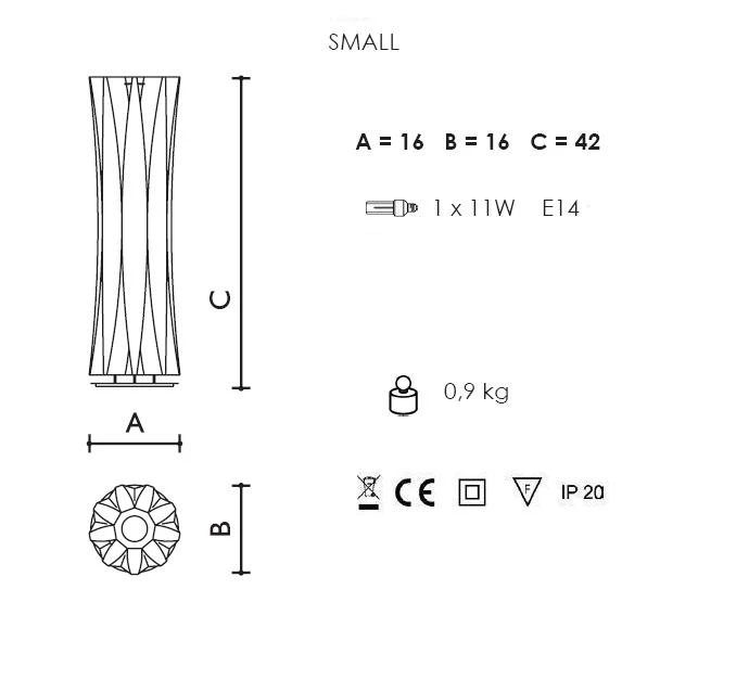 - Small: Ø16cm – Höhe 42cm – Leuchtmittel 1x E14 60W